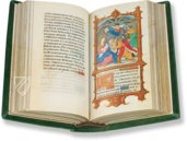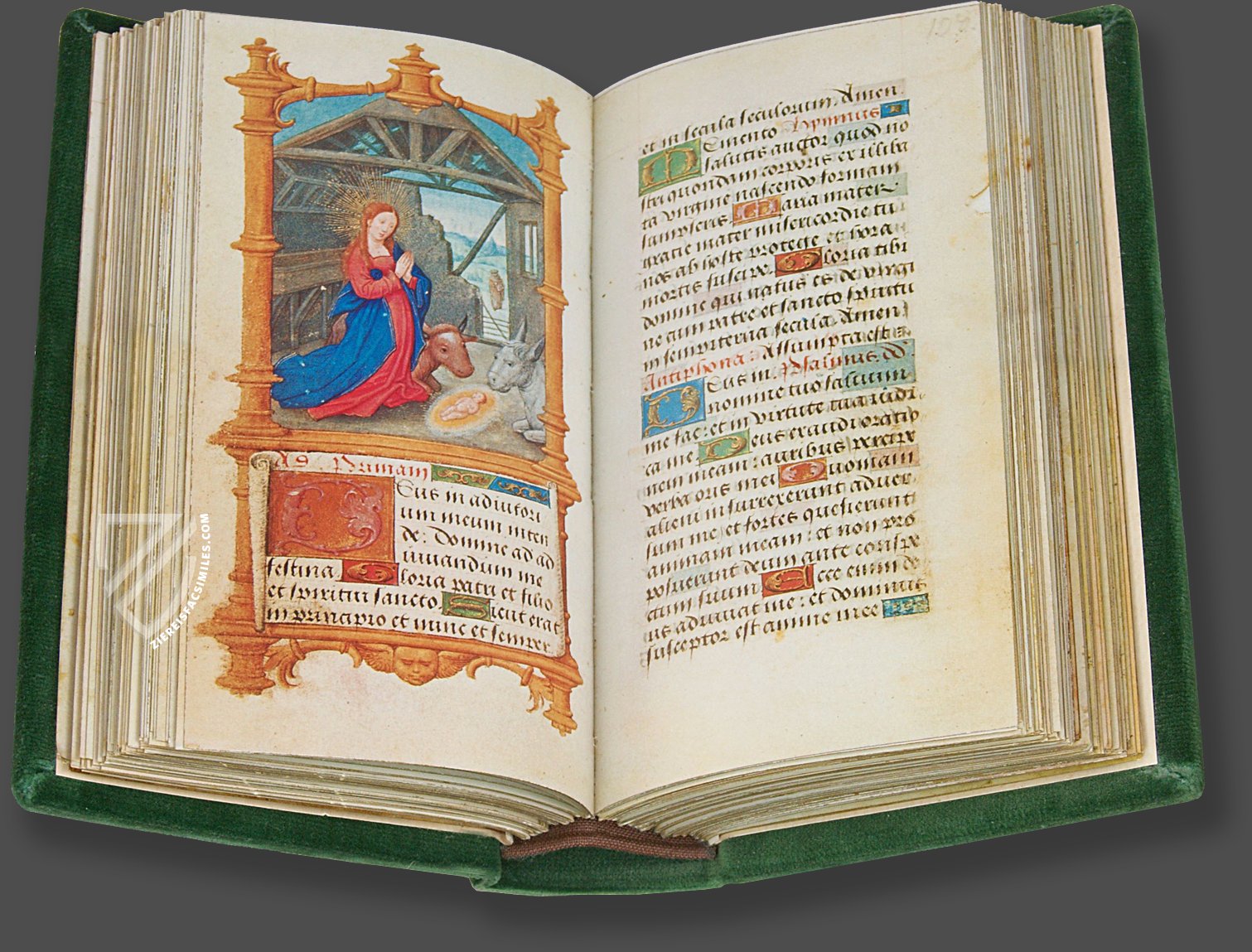 The book is written in Latin, a language comprehensible to any educated person of this period. Only a small number of prayers, some rubrics, and inserted instructions, are in French. The codex was written by a single hand following a specially devised plan, in a very diligent and delicate Burgundian bastarda. The noble simplicity of the script befits this precious object of private devotion. The outstanding value of this small format prayer book is further demonstrated by the use of the finest virgin vellum. The royal owner and zealous user of the manuscript, Charles V, is depicted on fol. 213v. On this page as well as the following one (fol. 214r), which represents the prayer to his own guardian angel, the text is nearly illegible due to soiling through excessive use. This prayer book, whose outward form reflects the dignity of its royal owner, served as a book of edification for the young sovereign who often sat with it in devotion and meditation.
