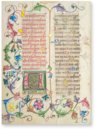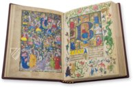 The Gothic text of the manuscript is arranged in two columns and are adorned with full-page miniatures, friezes, small framed scenes, and filigree initials β all splendidly rendered with vivid colors and gold. The pages of the manuscript are practically overflowing with artfulness. As is typical, the book begins with a calendar containing a complete lists of feasts and saintβs days, and the local nature of these holidays, particularly with respect to local saints, is one of the clues that allowed researcher to place the manuscript geographically. Each month is presented on a double-page illustrated with labors of the month and scenes from everyday life: blooming flowers in May, harvesting wheat in August, salting meat in December. Untypically, the calendars do not show the constellations associated with the month, merely displaying the corresponding zodiac sign. This section is followed by tables for calculating information based on the calendars, both for religious and medical purposes, i.e. when a bloodletting is a good idea and when to hold off. The purely religious sections of the book come next, i.e. the psalter and sacred hymns. Although originating from separate sources, they do share some stylistic elements, like friezes and initials that are almost identical. Although the details of this splendid specimenβs genesis remain a mystery, it can be said with certainty that this codex was intended for personal use, not liturgical.