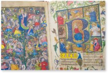 This splendid page introducing the Psalter section is a treasure of late medieval illumination. King David is depicted inside of the βBβ initial surrounded by the Evangelist symbols with banderoles and the four βFathers of the Churchβ: Gregory the Great, Saint Ambrose, Augustine of Hippo, and Saint Jerome.