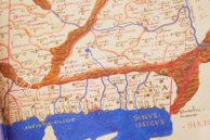 The handwritten atlas from the library of the University of Valencia was most likely produced in Naples. This illuminated codex is a transcript of the geographical treatise by Ptolemy from the Royal Library of the Castello Nuovo in Naples. The manuscript was illustrated with uniquely beautiful maps of land and sea. The maps shimmer in luminous colors and are hemmed by glimmering frames of noble gold leaf. The maps are accompanied by painted angels presenting the royal crown and escutcheon of Alfonso V of Aragon. He was the patron of the unimaginably expensive manuscript. All of the map titles are recorded in colorful, gilded script and the text of the work is structured by numerous luminous red initials and markings at important points in the text.