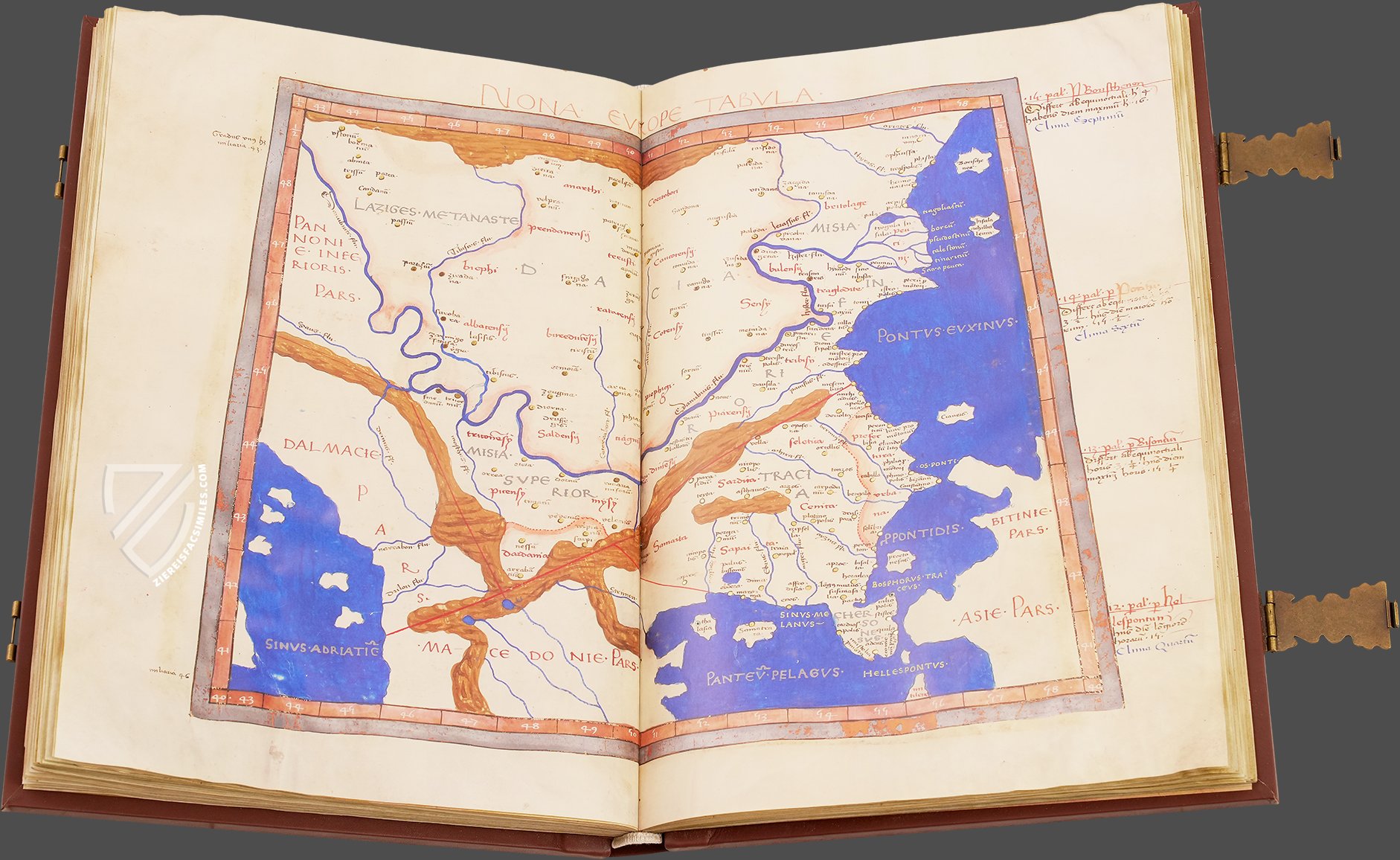 The great polymath Claudius Ptolemy composed a treaty in the 2nd century on geography that lost none of its value through the High Middle Ages. The first maps and atlases worldwide originated from this treatise. The atlas here at hand is one of the most beautiful adaptations of Ptolemy’s teachings. It originated in the 15th century at the behest of King Alfonso V of Aragon. The precious work is adorned with luminously colored maps and numerous ornaments of noble gold leaf.