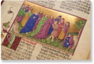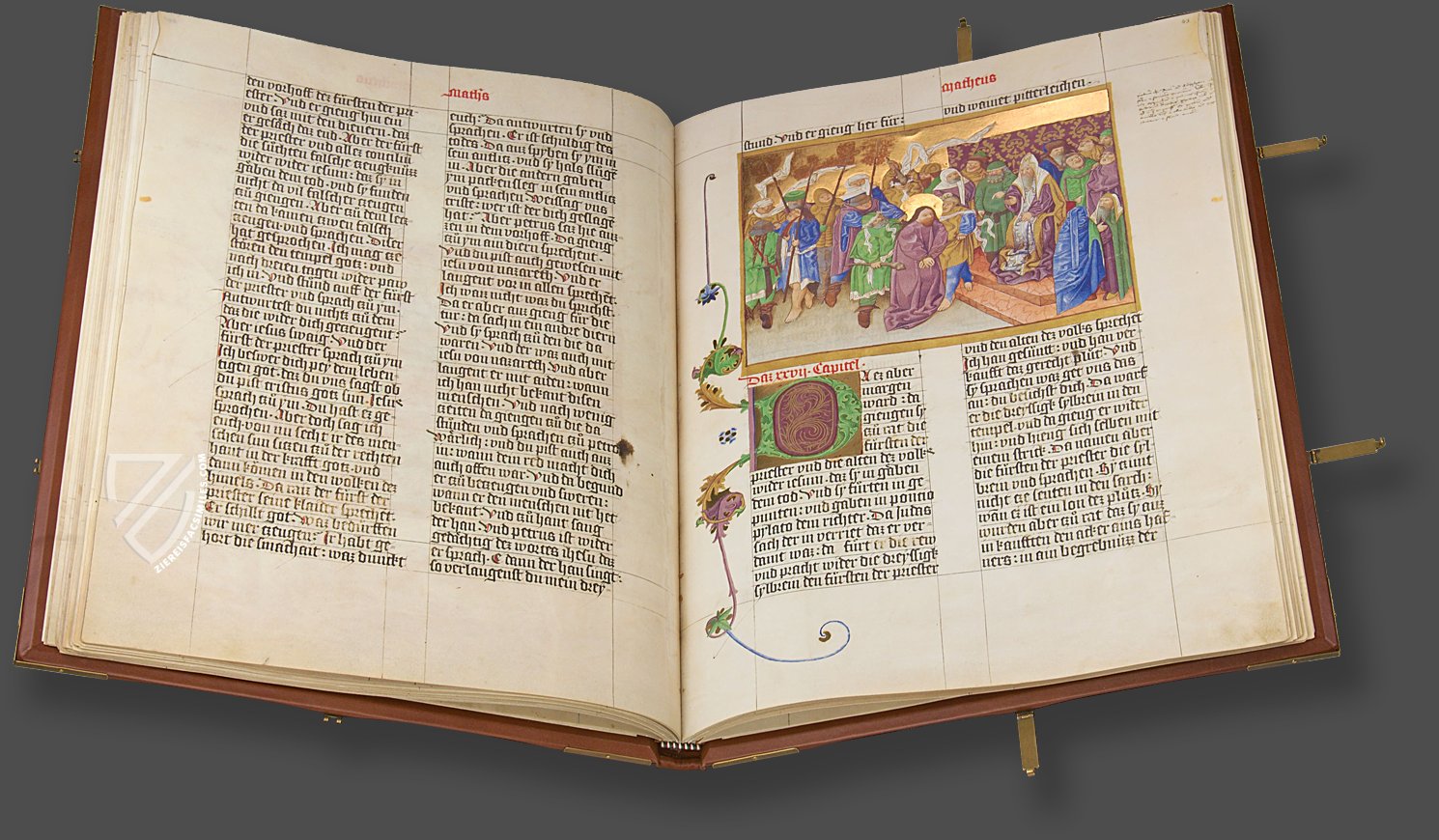 Work began on “first illustrated New Testament edition in German” ca. 1430 in Regensburg. The rich ornamentation of manuscript originates from the hands of several important masters of the “Regensburg School” of the 14th century and was completed 100 years later in the style of the German Renaissance. The enigma of the work’s patron was only solved a few years ago, with sources pointing to Duke Ludwig “the Bearded” of Bavaria-Ingolstadt. The Ottheinrich Bible is currently housed in Munich and the highly coveted manuscript has had quite the checkered past in terms of ownership. 46 half- or full-page miniatures with luminous golden backgrounds and vivid, eye-catching colors made from the most expensive materials. The text, neatly written in two columns, is adorned by 41 brushed gold initials and countless smaller initials in red ink.