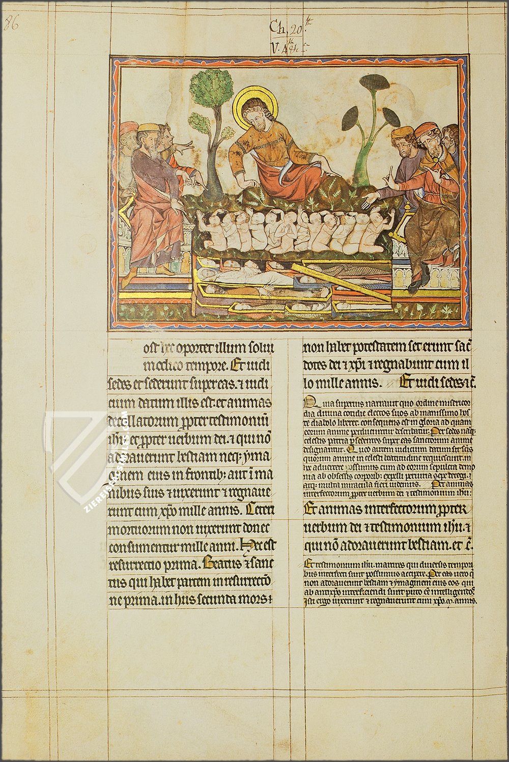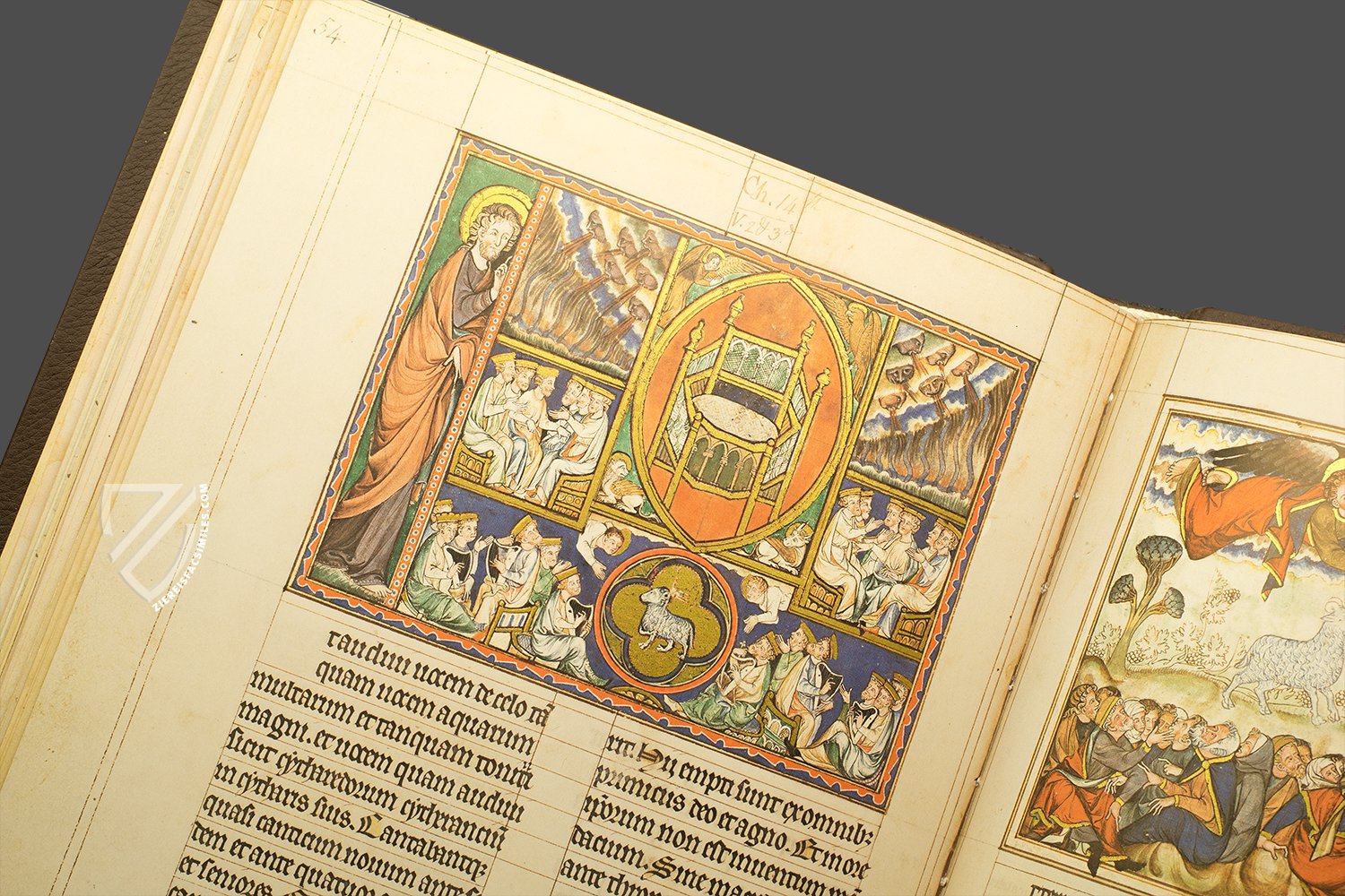 The Oxford Apocalypse or Ms. Douce 180 ranks among the most significant English manuscripts of the 13th century. The sheer number of its miniatures earns it a foremost position among all other illuminated works of this period. The artistic decoration and composition of the manuscript betray the strong personality and individuality of the artist who painted it. The use of landscape as a new element of miniature design lends the illustrations a fascinating, albeit peculiar liveliness. 97 miniatures in all accompany the Latin text of the Revelation of Saint John, the most mysterious book of the New Testament. The glorious framed miniatures are more than just mere additions to the text, indeed they are of central importance.