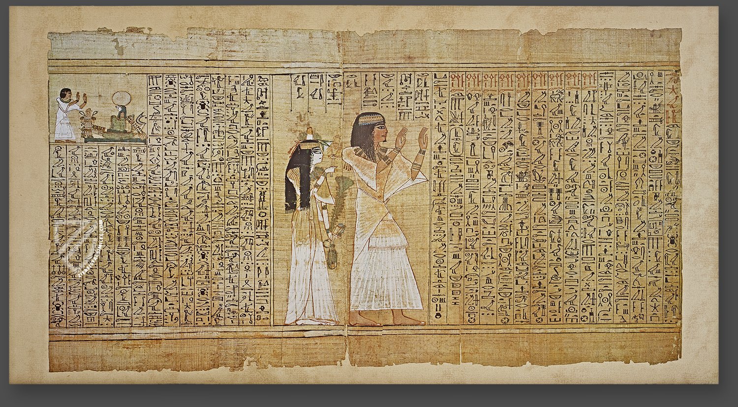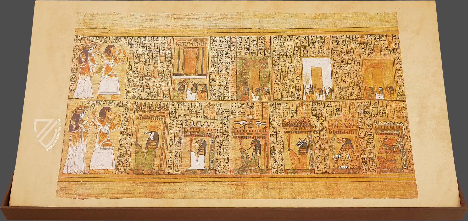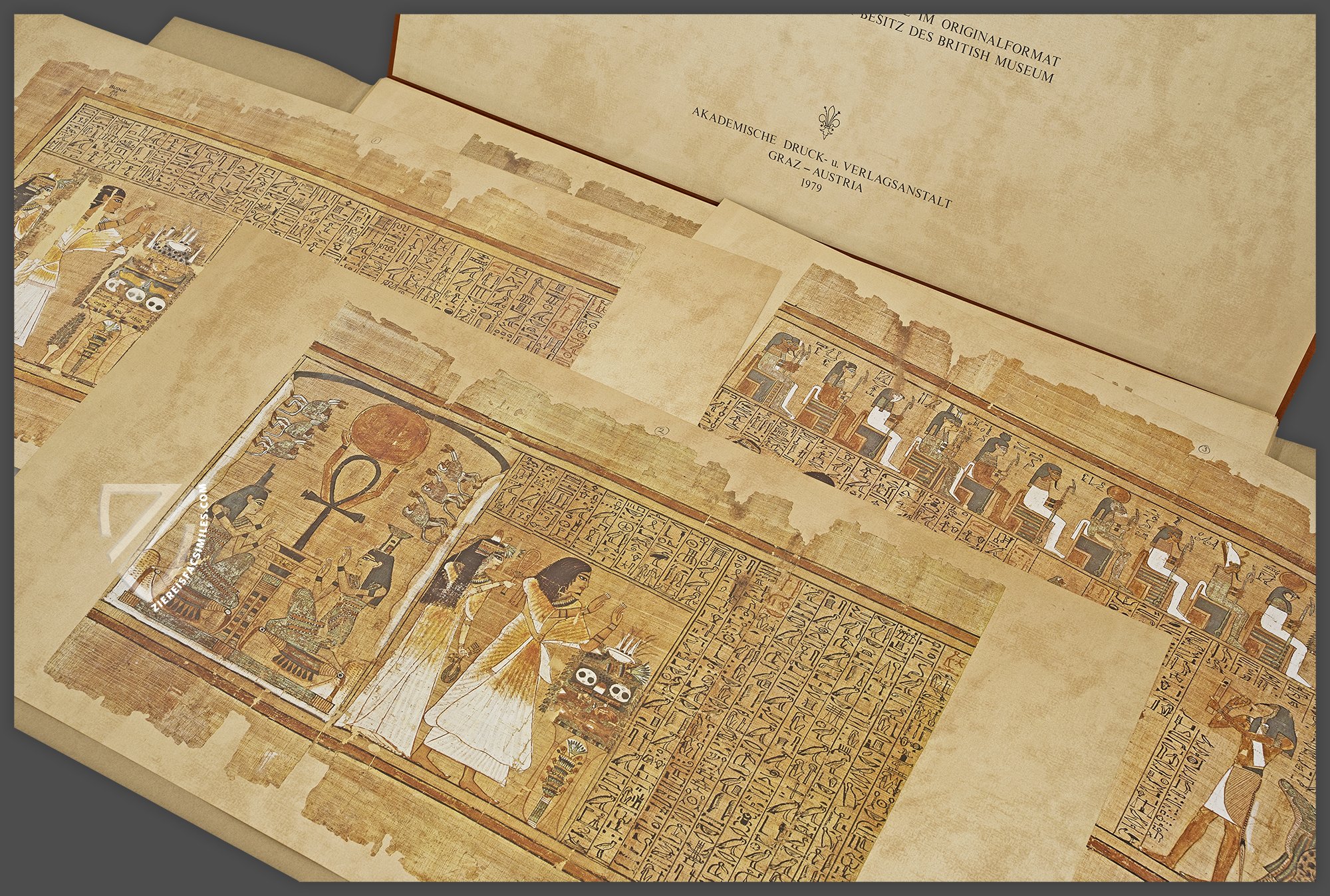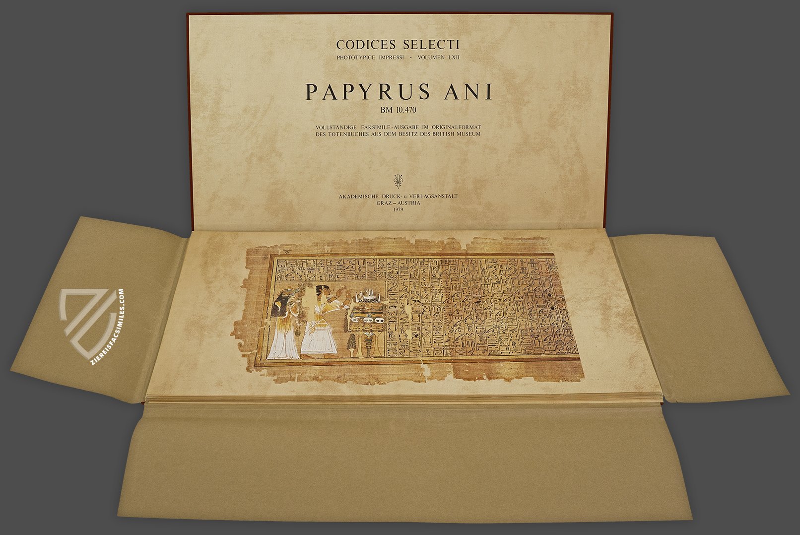 The Papyrus Ani is an exceptionally significant and insightful text of ancient Egyptian literature. The remarkably well-preserved book of the dead was found in Thebes and is dated to 1240 BC. To this day, only four unique copies of the work have survived, the ancient Egyptian title of which is actually βSayings of Going Out by Dayβ. The papyrus presents about 190 magical formulas, religious texts and particularly large colourful illuminations visualising the content of the text over an impressive 24 metres. The manuscript is therefore a central source for the study of the mythology and death cult of ancient Egypt. While mummification guaranteed the integrity of the body and the tomb served as a house for eternity, the books of the dead were intended to provide the deceased with the necessary information about the afterlife. There, it was believed that the dead had to fend off various dangers, reach paradisiacal realms and finally ask to be accepted by the gods.