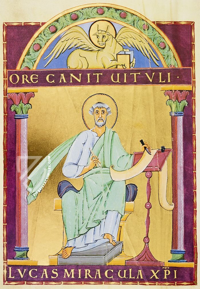 This fine Evangelist portrait has all the hallmarks of Ottonian illumination: classical forms, imperial purple, and gleaming a gold leaf background. As his Evangelist Symbol – the winged bull or ox – looks down approvingly and holding the Gospel about to be written, Saint Luke works diligently and uses both hands: his right hand holds a gold stylus and his left holds a pen-knife. The scene is remarkably Byzantine with respect to its burnished gold background and the rigidity of its forms.
