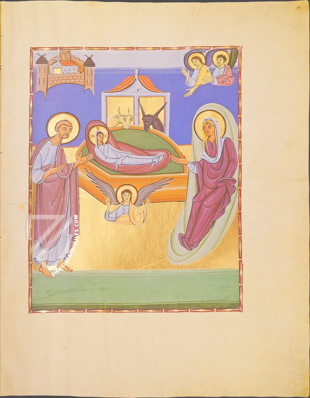 This Nativity scene is an exemplary Ottonian composition: static figures with large eyes and expressive gestures, classically-styled robes, and a background consisting of bands of monochromatic colors and Byzantine-style burnished gold leaf. The Holy Family is depicted wearing purple robes, a nod to this manuscript’s origins from an imperial commission.