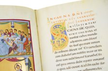 The Pericopes of Henry II is the most beautiful and extreme expression of the aesthetic of the Liuthar group, a collection of manuscripts produced between 990 and 1015 in the famous scriptorium of Reichenau Abbey, the largest and most important in Europe at the time. Emperor Henry II (973–1024), the only canonized German monarch, commissioned numerous luxury biblical manuscripts, a sign not only of his personal piety, but of the close ties between his imperial administration and the church. The last of the Saxon dynasty, his reign also saw the peak of Ottonian art, during which time some of the greatest masterpieces of medieval illumination were created, and which directly preceded the emergence of Romanesque art, Europe’s first international artistic style. This large format manuscript is distinguished by dozens of large gold historiated initials and miniature pages with brilliantly burnished gold backgrounds, some of the first to appear in western illumination.