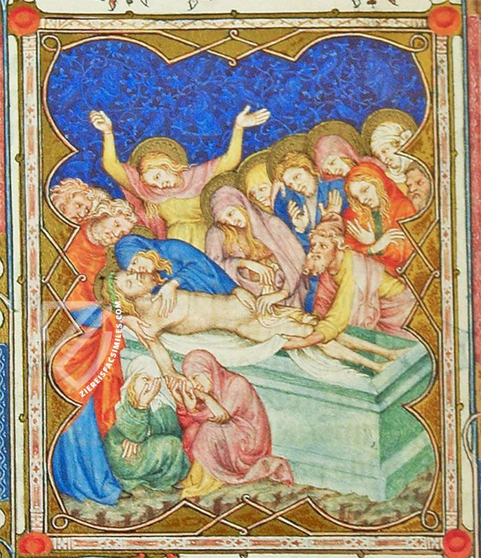A popular subject in Western art since the 10th century, this scene of the burial of Jesus is tremendously dramatic due to the gestures and expressions of the figures who have crowded together around the Savior. This is further enhanced by the stark contrast of dark and bright colors along with subtle yet masterful shading. Women make up the majority of the mourners, the Virgin Mary gives her son a last kiss while another cradles his arm; only one man has a halo, likely Joseph of Arimathea.