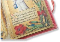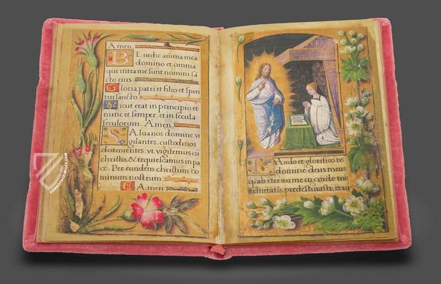 The enchanting Petites Prières of Renée de France was created around 1517 for the younger sister of the French queen Claude de France (1499–1524) by the renowned illuminator named after the bibliophile queen, the Master of Claude de France. It is undoubtedly one of the most magnificent prayer books of the French Renaissance and is particularly impressive for its outstanding book decoration. Astonishingly naturalistic depictions of flowers of all kinds transform the pages of the work into a true sea of flowers. The ornate bouquets often look as if real flowers were lying on the parchment pages of the manuscript. They frame both text and image pages, in whose gold-decorated, artistic miniatures the owner of the codex, Renée de France (1510–1574), is depicted no less than five times. After the manuscript miraculously survived religious wars, book burnings, and other turmoil over the centuries, it was stolen in 1994 during an exhibition at the Abbey of Montecassino and remains missing to this day.
