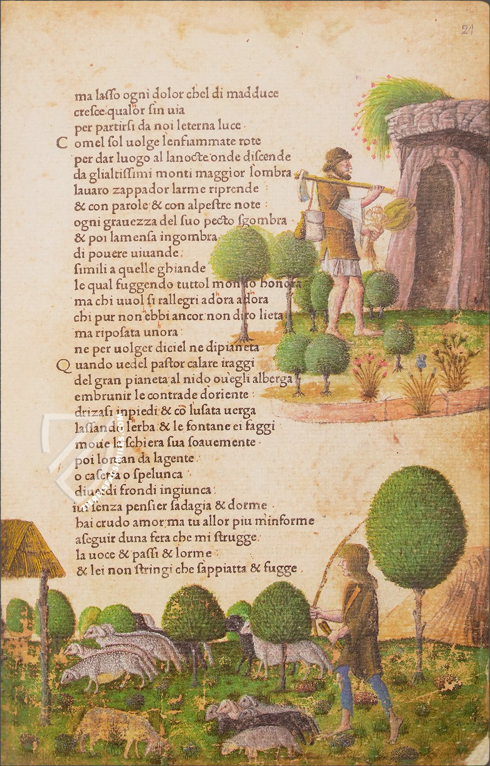 The Petrarca Queriniano has even more to offer: it is not only a valuable incunabulum, but was also gorgeously and individually illustrated. A Venetian poet and Miniaturist named Antonio Grifo, who is also ironically named in literature as a queriniano dilettante, was responsible for the extravagant decoration of the book. Grifo filled the work from the first page to the last with impressive creativity and fantasy in luminous colors. He expressed both his own interpretations as well as references to the tradition of Petrarch illustrations. Thus he created gorgeous figurative scenes amidst green trees and fields, splendid initials, and marginal decorations sometimes endowed with gold. This splendor is an indication that the edition was probably intended for a noblewoman. Today, the unique edition of the Petrarca Queriniano in Brescia is still an impressive testimonial to the tremendous esteem and popularity of Petrarch during the Renaissance.