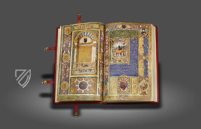 All seven of the carefully arranged, predominantly red, blue, and gilded diptych-like double-pages are covered in finely executed miniatures: even the margins of pages, usually kept white, are painted in yellowish green with lace-like gilding. On the left-hand side you can read the contents index of the codex in the form of a monumental inscription: the gilded bronze sheet with embossed letters is in the frame of a white stone niche. On the pedestal of the building there is the imitation of an antique relief depicting a fight among sea gods. On the left, King Matthiasâs antique-like medallion portrait appears surrounded by white putti and hanging arms, having the portraits of Nero and Hadrian, the two Roman emperors especially predisposed to Greek culture, on his two sides. (The caption in the medal calls Matthias, King of Hungary and Bohemia and Prince of Austria.) In the middle of the other side, there is the imitation of an oval bronze relief, showing Apollo, Olympus and Marsyas, modelled on a famous antique carnelian-intaglio (an engraved semi-precious gemstone) in Lorenzo deâ Mediciâs art collection. There is a triumphal procession on the initial of the page on the right-hand side. The tiny crowned figure on the chariot has been identified as Matthias inter alia, while in other cases as his son JĂĄnos Corvin. The prologue actually describes the triumph celebrating the conquest of Wiener Neustadt. Both pages have Matthiasâs coat of arms at the bottom (on the right, the shield also features Austriaâs silver-swathed crest against a red background.) The ornaments on the margins feature the royal emblems (a beehive, a barrel, an hour-glass, a dragon and a well).