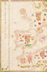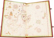 The Majorcan school of cartography was one of the most important schools of cartography in Europe in the late Middle Ages and was particularly valued for its portolan maps. It was in this school that the Majorcan Bartolomeo Oliva received his excellent training, which was followed by a long career that took him among others to Messina and Venice. One of his most beautiful works are the Portolan Charts, which are kept in the Bodlein Library and depict all the seas between the Levante and the Brazilian coast. In keeping with Majorcan tradition, they not only show the meticulously inscribed coastlines, but are also magnificently illuminated. Important topographical features such as major cities and mountains are marked in red and green, while enthroned rulers command the vast land masses. Each map is decorated all over with precious gold, making this atlas a very impressive representative object.
