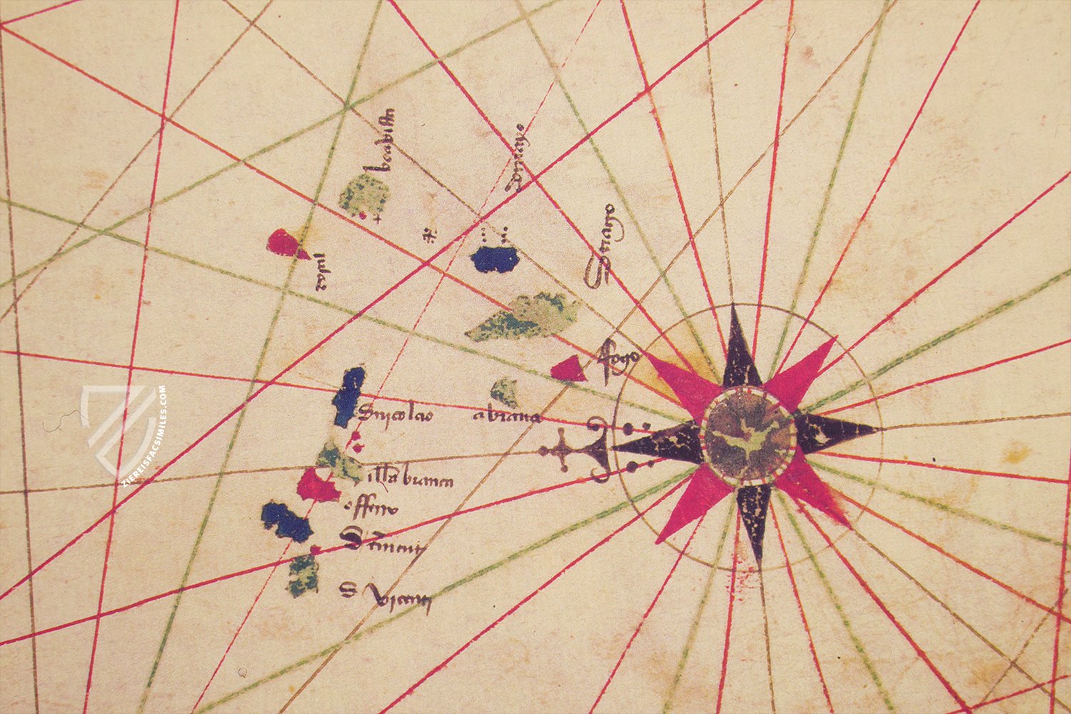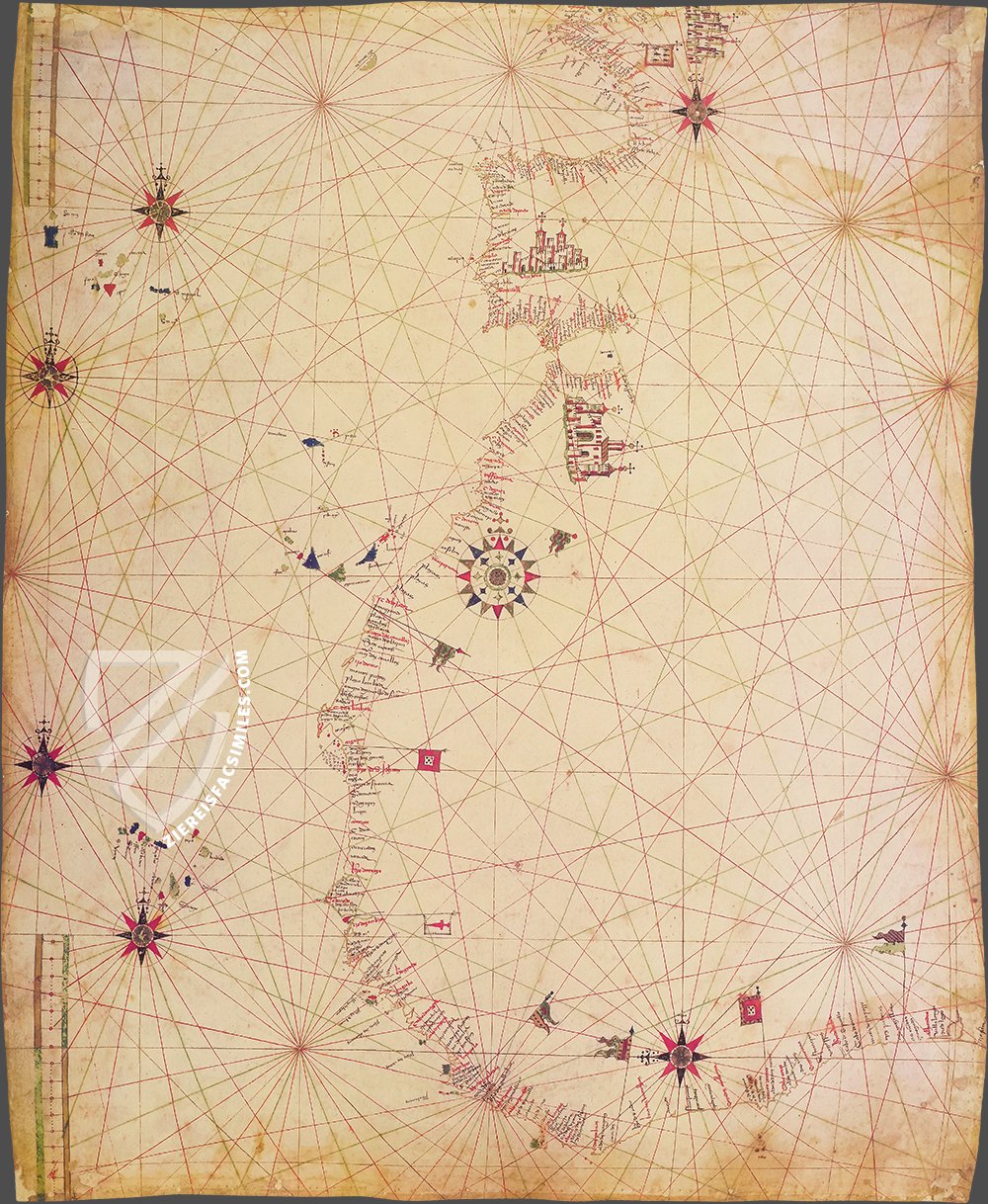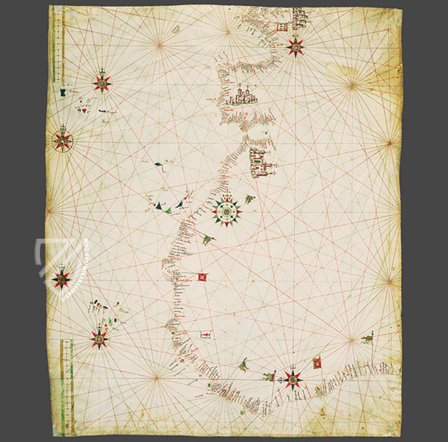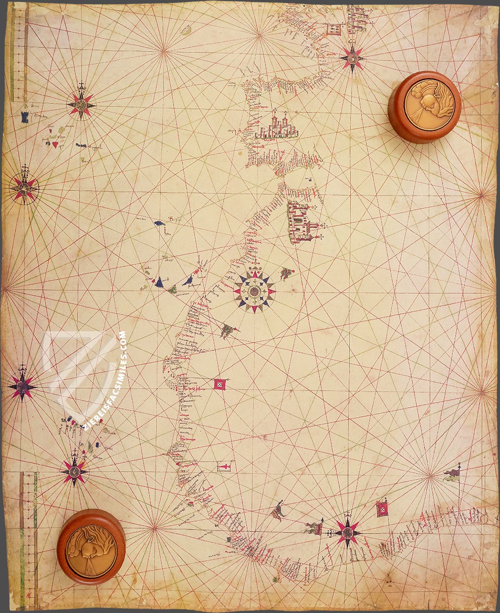 The Portulan C.G.A.5.c was created between 1472 and 1482 by a talented but anonymous Portuguese cartographer. It is the oldest evidence of Portuguese cartography, which produced arguably the most important school of cartography of the Renaissance and is known for its amazingly realistic nautical charts. Among other things, the map shows the discoveries on the coast of Africa, which Fernando Gomes made only shortly before it was created. In addition, the cities of Lisbon and Ceuta, which were flourishing at the time, were particularly highlighted. The level of detail of the correctly depicted coastlines is astonishing, making this map a particularly fascinating testimony to the early days of the Portuguese cartographic school, which is now kept in the Biblioteca Estense in Modena.