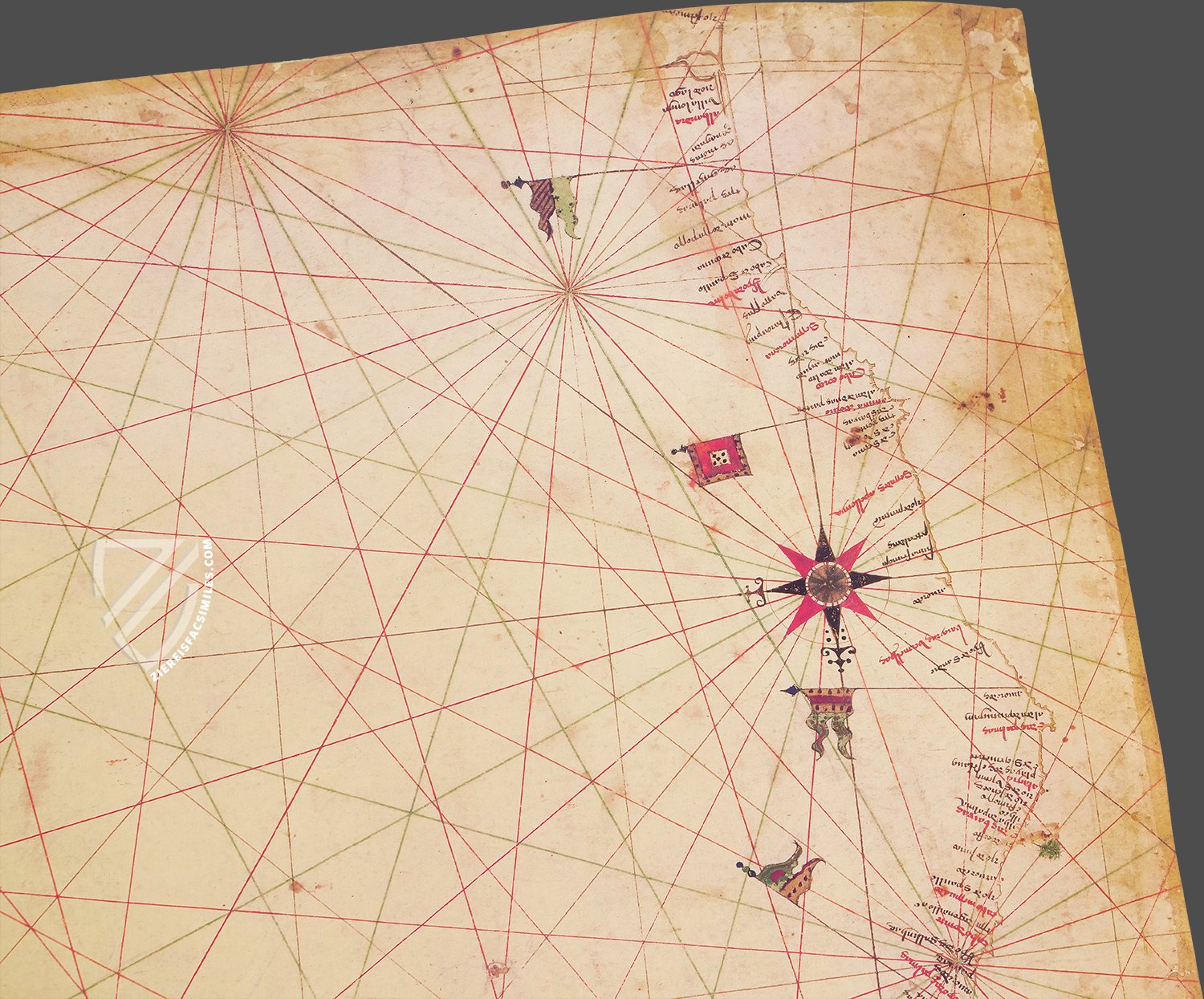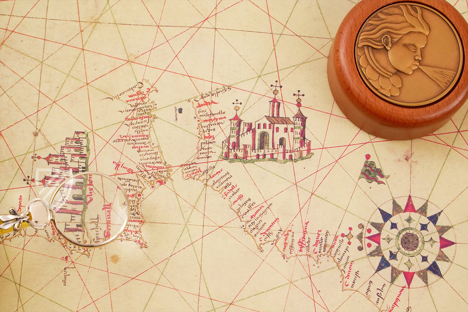 It is not known who exactly is responsible for the creation of Portulan C.G.A.5.c, but its formation period has been dated between 1472 and 1483. This is based on the special emphasis on the cities of Lisbon and Ceuta, which enjoyed a blossoming of trade and culture during this time. The faithfully detailed and geographically correct map demonstrates how astounding the knowledge of Portuguese cartographers was during the Renaissance. He managed to create maps completely without modern technical aids that are still of importance for our modern navigation today.