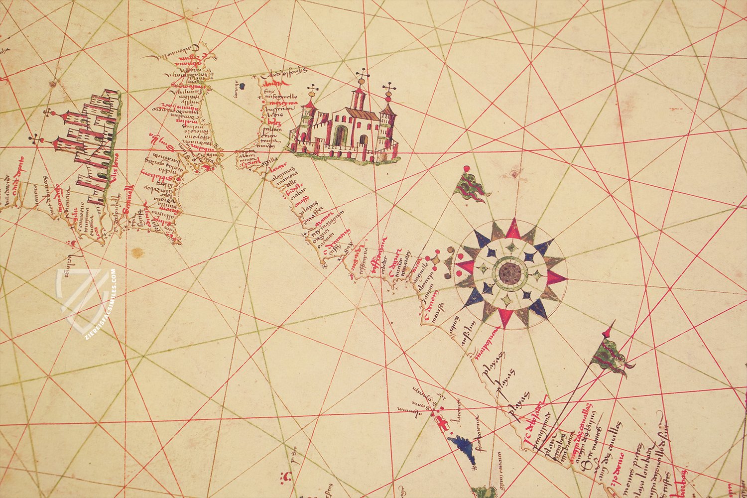 - The map is decorated with detailed cityscapes and several wind roses as well as different colored flags