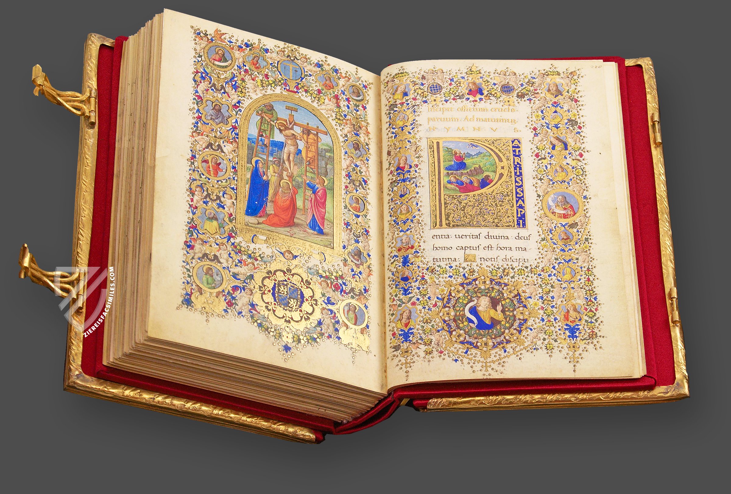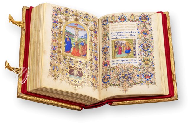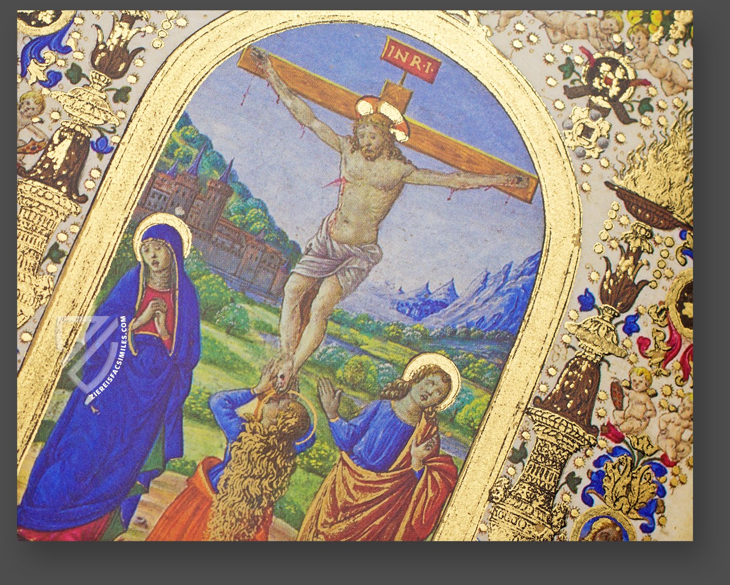 The painter Francesco Rosselli showed particular discipline in designing individual pages with an architectural pattern of dΓ©cor. While large primary scenes such as the Annunciation or the Crucifixion are encompassed in arched frames, appearing underneath them are smaller pictures in quatrefoil or multi-foil frames. The entire composition was then encompassed by repetitively detailed decorative motifs such as foliage, diamond rings, or winged cherubs. Thus, the impression is given that every page is decorated down to the smallest detail, making it possible to continuously discover something new.