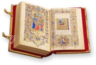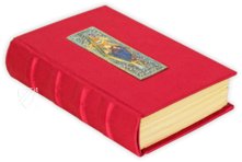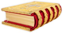 The beholder is made aware of the preciousness of the manuscript even before they lay eyes on its luminous miniatures. A radiant gilded silver binding houses the prayer book. The silver plates of both covers are interlinked by five hinges decorated with vegetal dΓ©cor. The richly ornamented front cover displays a diamond-shaped enamel work in the center field with the Archangel Gabriel, while Mary can be seen on the back cover. The binding alone demonstrates that this is an exceptionally precious manuscript.