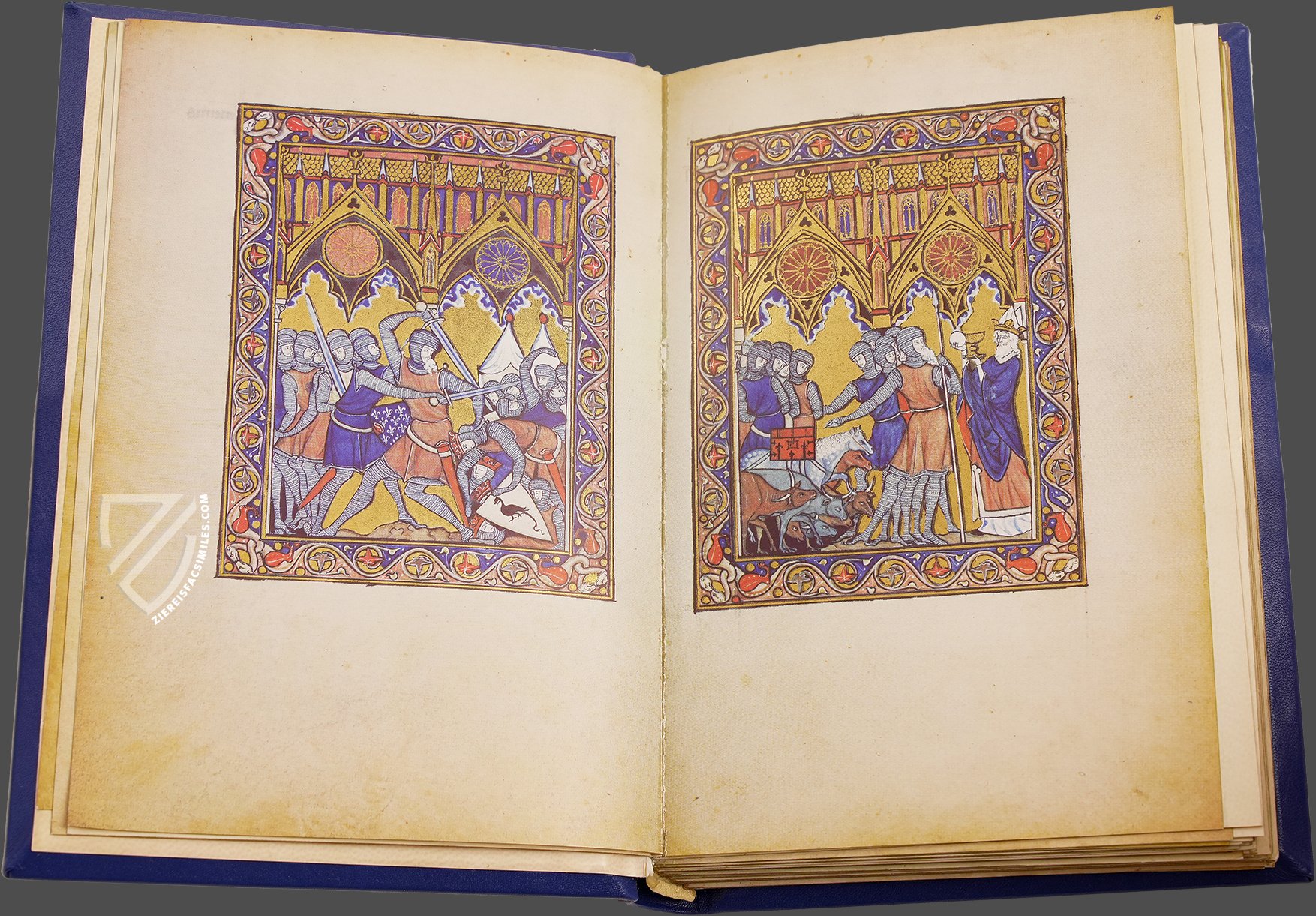 The biblical scenes are all depicted on a sumptuously-burnished golden ground, thus lending the pictures an appearance of unequalled splendid glory. The back of each miniature, painted on beautiful bright vellum, has been left blank to avoid the impairment of the pictures due to colors seeping through from the other side of the page. When opening the book, the beholder thus sees either two paired miniatures or two legends in French inscribed by a contemporary scribe on the verso side of each page. Although the manuscript seems to be the work of a team of illuminators, as was the case with most medieval manuscripts, it reflects great coherence. Most of the miniatures conform to the same design, the upper part being ornate with architectural motifs, a common feature of the early medieval tradition. The space below the architectural section is composed of two equally large oblong surfaces, usually representing Old Testament scenes. The figures are slender, graceful, and of a noble and elegant posture. They convey a feeling of harmony and movement, strangely contrasting with the seriousness and sometimes even the horror of the topics treated. Besides the deep blue and rose in the vestments of the depicted persons, one also finds light green, grey blue, and delicate tones of rose emerging timidly.
