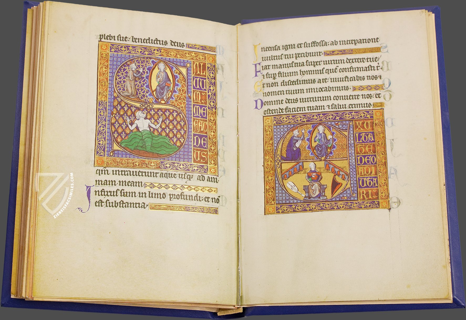 Only a small number of manuscripts in the Bibliothèque Nationale may surpass the Psalter of Saint Louis in value and celebrity. Its value as one of the foremost artistic documents of French Gothic resides not only in the fact that it belonged to this French sovereign (1226–1270), whose great sense of justice and statesmanship were widely known, but also in the close relationship between its miniatures and the stained glass windows of the Sainte-Chapelle in Paris. This precious manuscript today holds 260 leaves, including 78 sumptuous full-page miniatures and eight magnificent figural initials. The miniatures literally illustrate diverse scenes of the Old Testament and undoubtedly represent a highlight of Gothic illumination. The text pages of the calendar and the Psalms in Latin perfectly match the pictorial decoration. They greatly contribute to the Psalter of Saint Louis, which is considered a masterpiece of book illumination, with their consistently executed calligraphy, elegantly balanced text layout, and rich decoration. Much like the stained glass windows in the Sainte-Chapelle, of which we are reminded in various aspects, the psalter not only constitutes a work of art but was mainly intended to provide a deeper understanding of the scriptures.