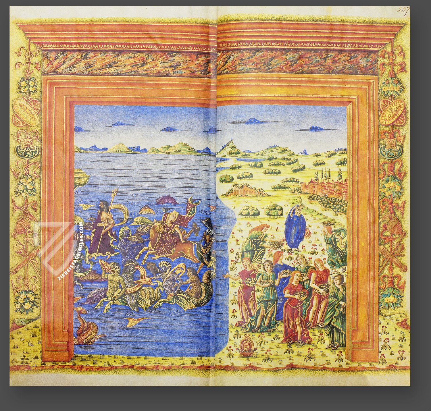 The famous geographic work by Claudius Ptolemy, known by the Latin name Cosmographia, was a groundbreaking work of the 2nd century. Lost for 1,000 years, it was first rediscovered during the time of the Italian Renaissance and frequently adapted. One of the most beautiful specimens of the Cosmographia by Claudius Ptolemy is stored today in the French National Library in Paris. It arose ca. 1490 in Naples at the behest of Andrea Matteo III Acquaviva and, totally in the spirit of the Renaissance, enchants with its wonderful charts and overwhelming pictorial adornment. Something special about it is its unusually small format for a geographical work. The Parisian Codex of the Ptolemy Cosmography offers the wonderful opportunity to get to know both the groundbreaking scientific findings of Ptolemy and the great art of the Italian Renaissance!