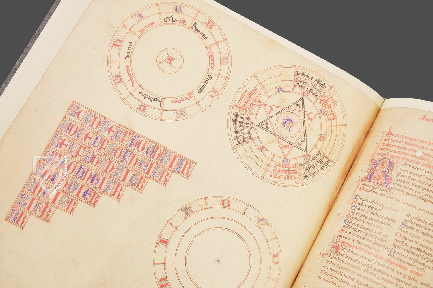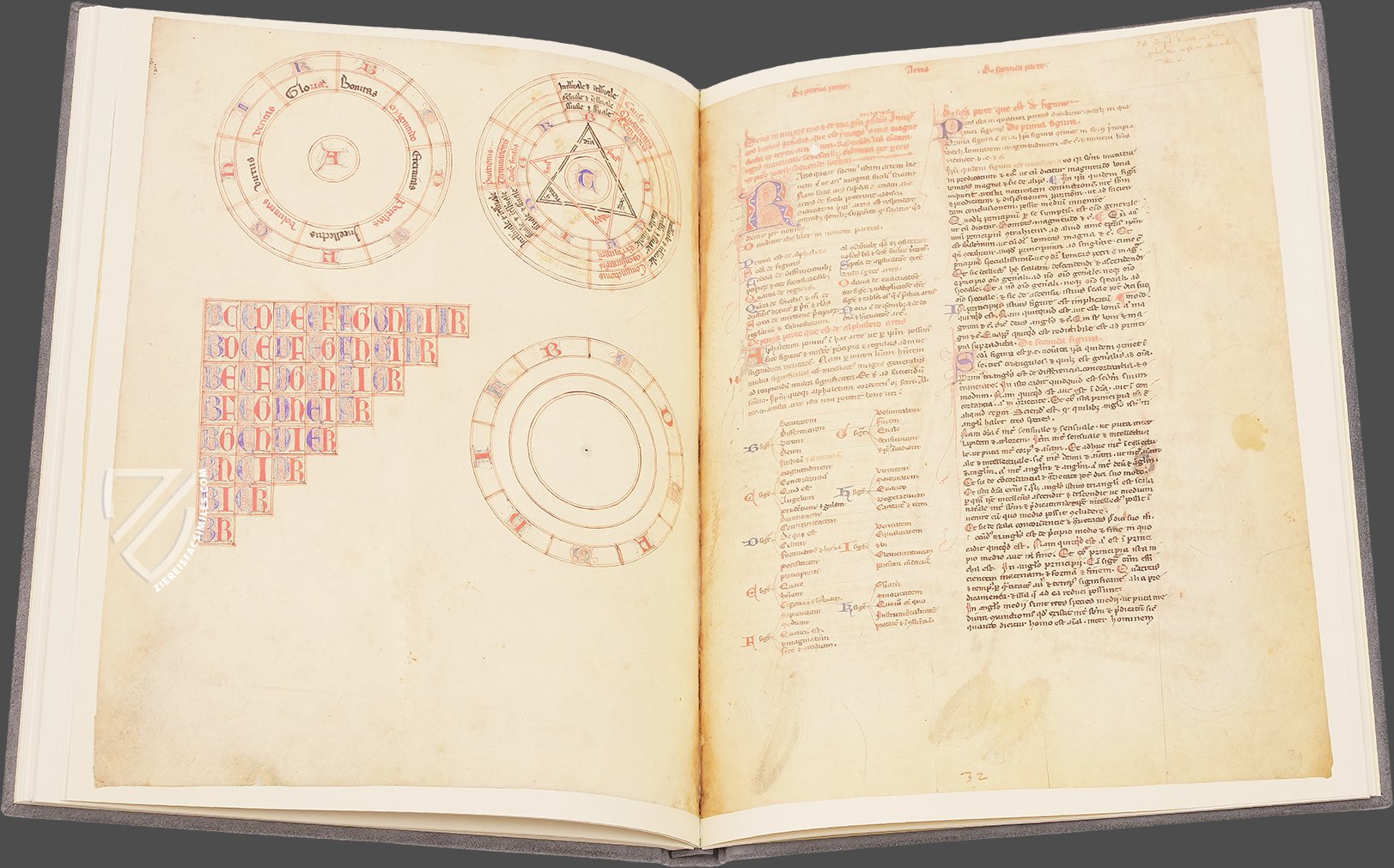 The manuscript was created by Thomas Le MyΓ©sier (d. 1336), who was taught and mentored by Lull, and appears to have been made in northern France within a few years of his masterβs death in 1316, probably ca. 1321. It was commissioned by the French Queen, probably Joan II of Burgundy (1292-1330), in order to bring Llullβs teachings to the French court of King Philip V (ca. 1293-1322). Since then, the manuscript has experienced a turbulent ownership history over the next five centuries during which time it passed through various hands. It first left Paris for Poitiers in the 16th century where it came into the possession of a canon of the Cathedral of St. Pierre. It is not documented what happened to the manuscript between 1582 and 1736, when it was sold by Freiburg jurist Joseph Anton Weigel to Ulrich BΓΌrgi, the abbot of the Benedictine monastery of St. Peter in the Black Forest. Following the secularization of the monastery in 1806/07, it was absorbed along with the rest of the monastic library into the Court Library of the Grand Duke of Baden in Karlsruhe, which evolved into the modern Baden State Library.