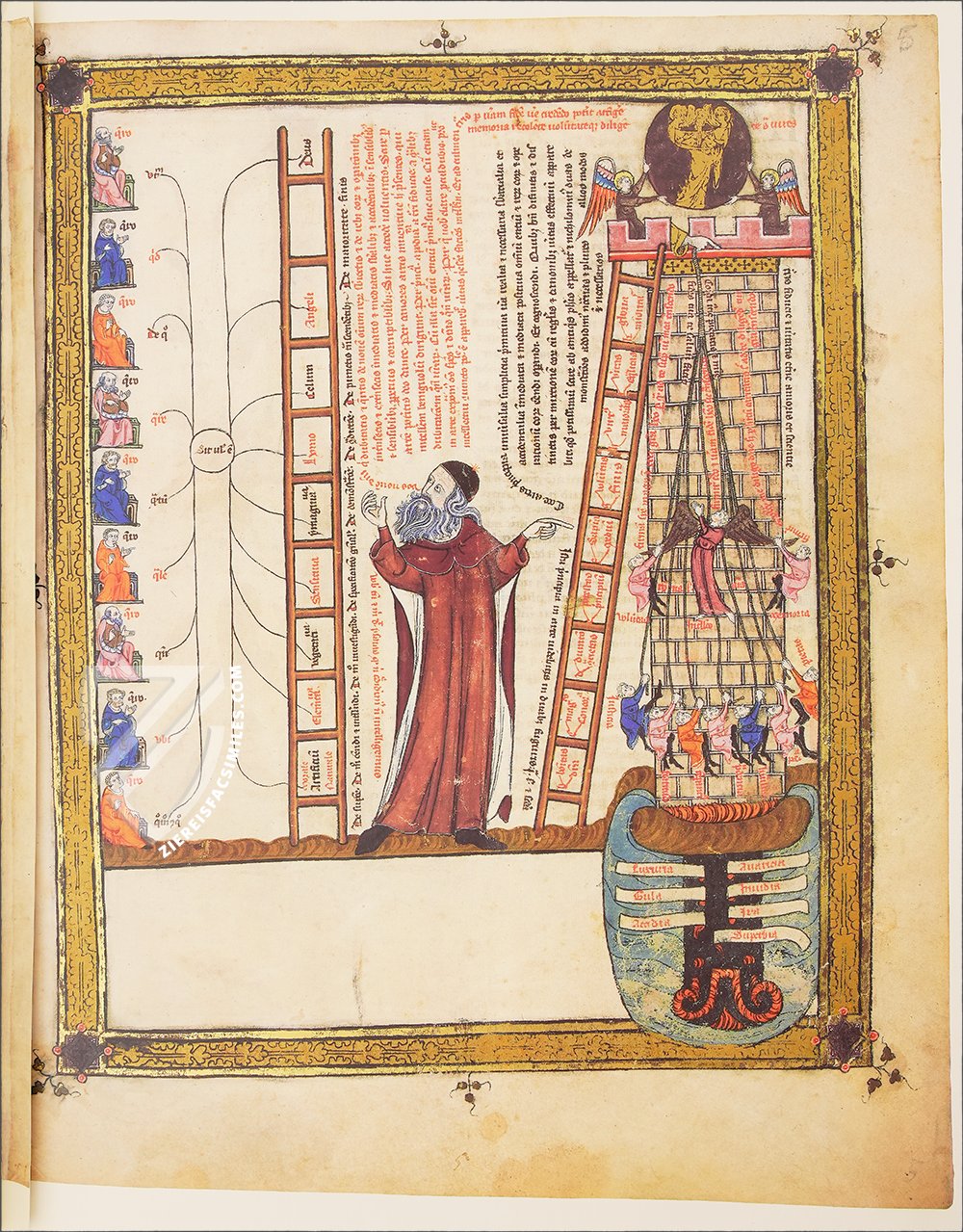 Most of the miniatures depict scenes from Llullβs life beginning with his religious epiphany in 1263 and ending in 1307 during his second trip to Tunis, where he debated with Muslim scholars. His lithe Gothic figure is dressed in a simple brown habit and he sports a full grey beard as the reader follows his travels and works. The rest of the miniatures are allegorical in nature and demonstrate principles from Llullβs philosophical teachings, including a beautiful miniature of he and MyΓ©sier presenting his works to a French Queen framed by a splendid Gothic architecture. Furthermore, because of MyΓ©sierβs close relationship with Llull and his supervision of the manuscriptβs production, the miniatures are thought to be unusually accurate in their depiction of Llullβs physical appearance, which is exceptionally rare in medieval art.