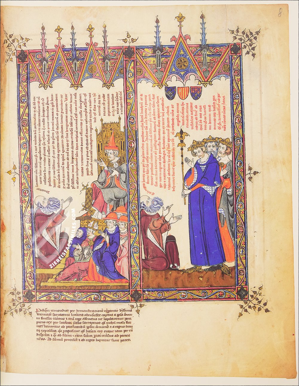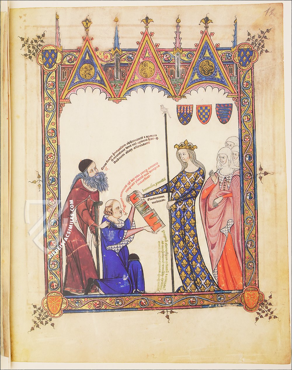 This presentation miniature is set within a brightly colored and gilded frame with Gothic architectural elements and the coats of arms of the Kingdoms of France and Navarre. Ramon Llull, depicted resting on a crutch, and his kneeling disciple Thomas le Myesier present three codices containing anthologies of Llullβs works to Joan II of Burgundy, the Queen consort of France and Navarre and wife to King Philip V.