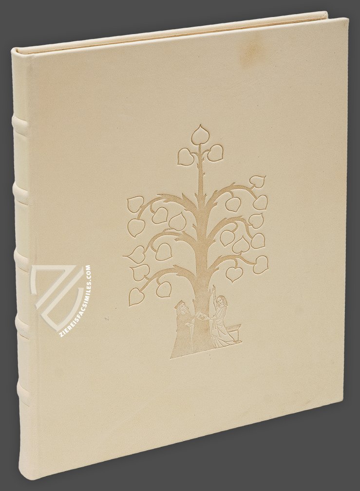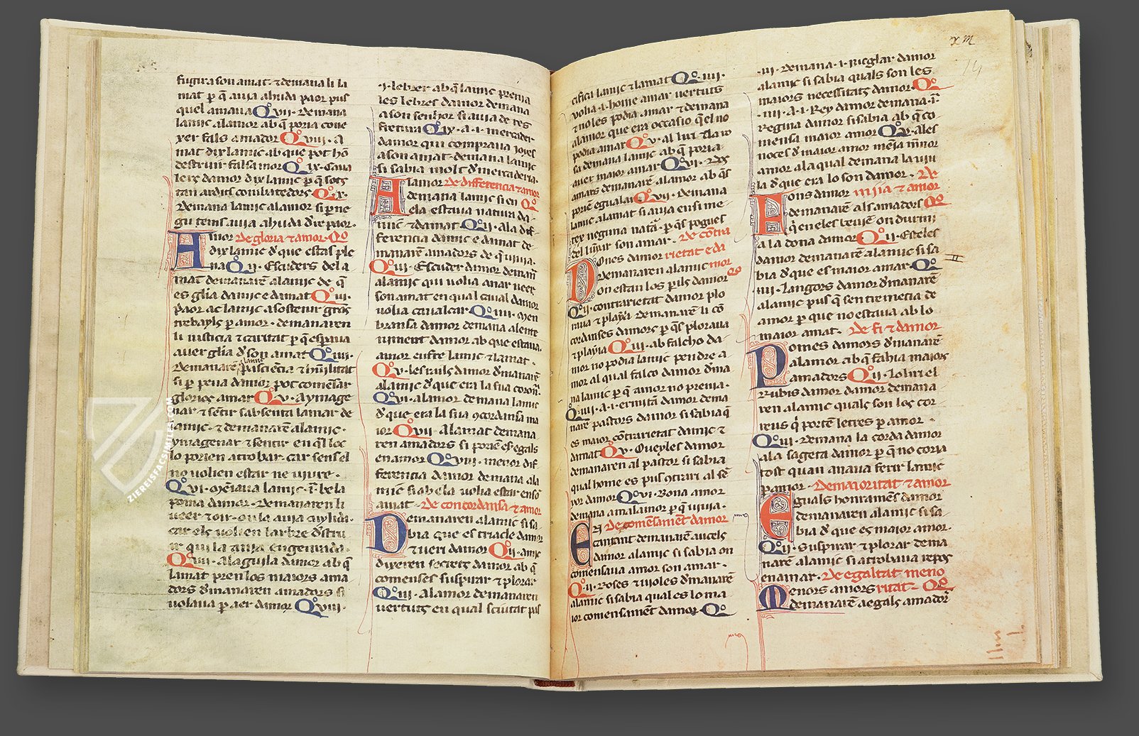 A precious manuscript of this work is stored in the Biblioteca Diocesana von Palma de Mallorca. Originating in the 14th century, it belongs among the most direct textual witnesses of the work in the Catalan language. Alongside the text, the manuscript contains seven gorgeous large-format picture pages with depictions of schematic trees and figurative illustrations. The text is also lavishly designed with gorgeously colored initials.