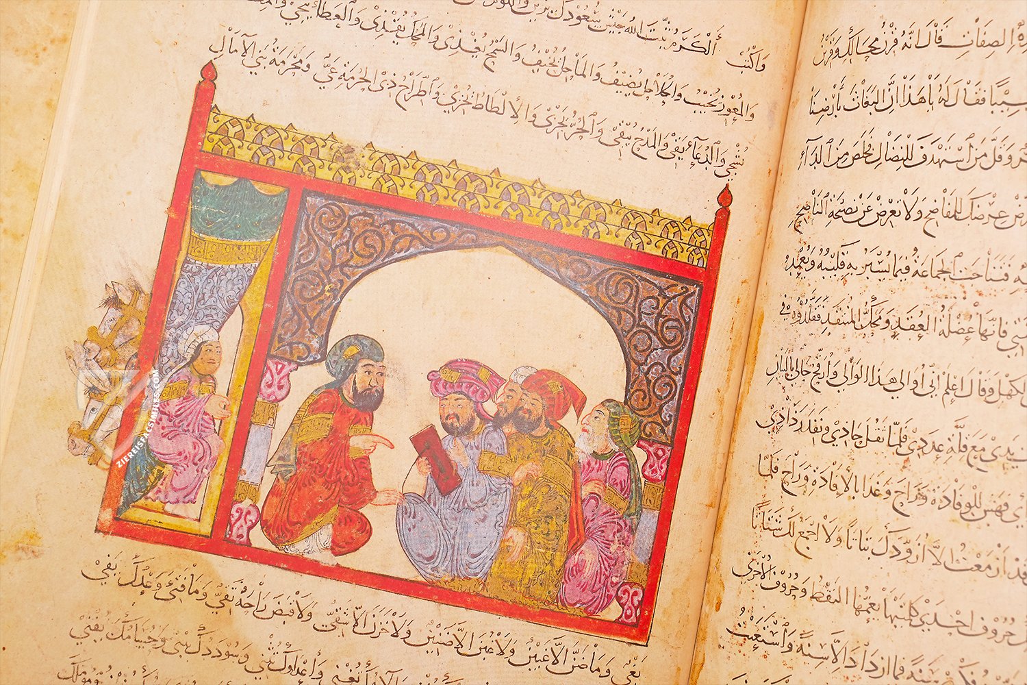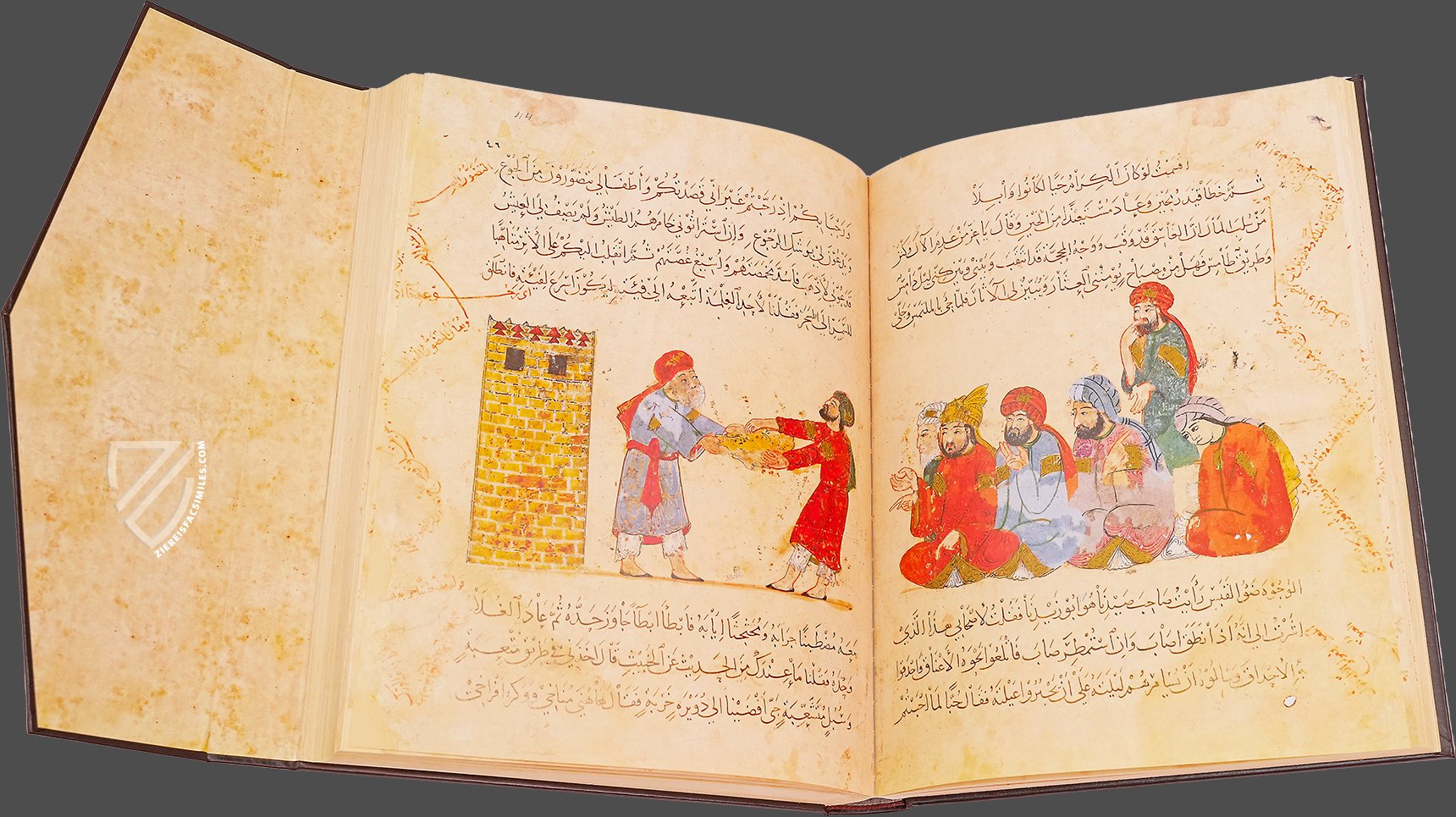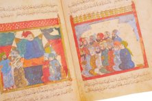 This manuscript simultaneously represents the finest surviving specimen of the Maqamat Al-Hariri or The Assemblies of Al-Hariri and also features some of the most famous images of daily life in the medieval Islamic world. The work by Al-Hariri of Basra (1054–1122) consists of 50 short stories taking place across the Arab world. The specimen of the work at hand was transcribed and illustrated by Yahya ibn Mahmud al-Wasiti, a 13th century Iraqi painter and calligrapher. The 99 miniatures, rendered vividly but subtly with a diverse color palette and gold leaf, can be found in almost any book regarding medieval Islamic art and culture. The manuscript created by al-Wasiti in southern Iraq between 1236 and 1237 is unrivalled among the manuscripts created of this popular text, which appeared in manuscripts from as far away as Spain and continued to be presented in illuminated manuscripts until the 18th century.