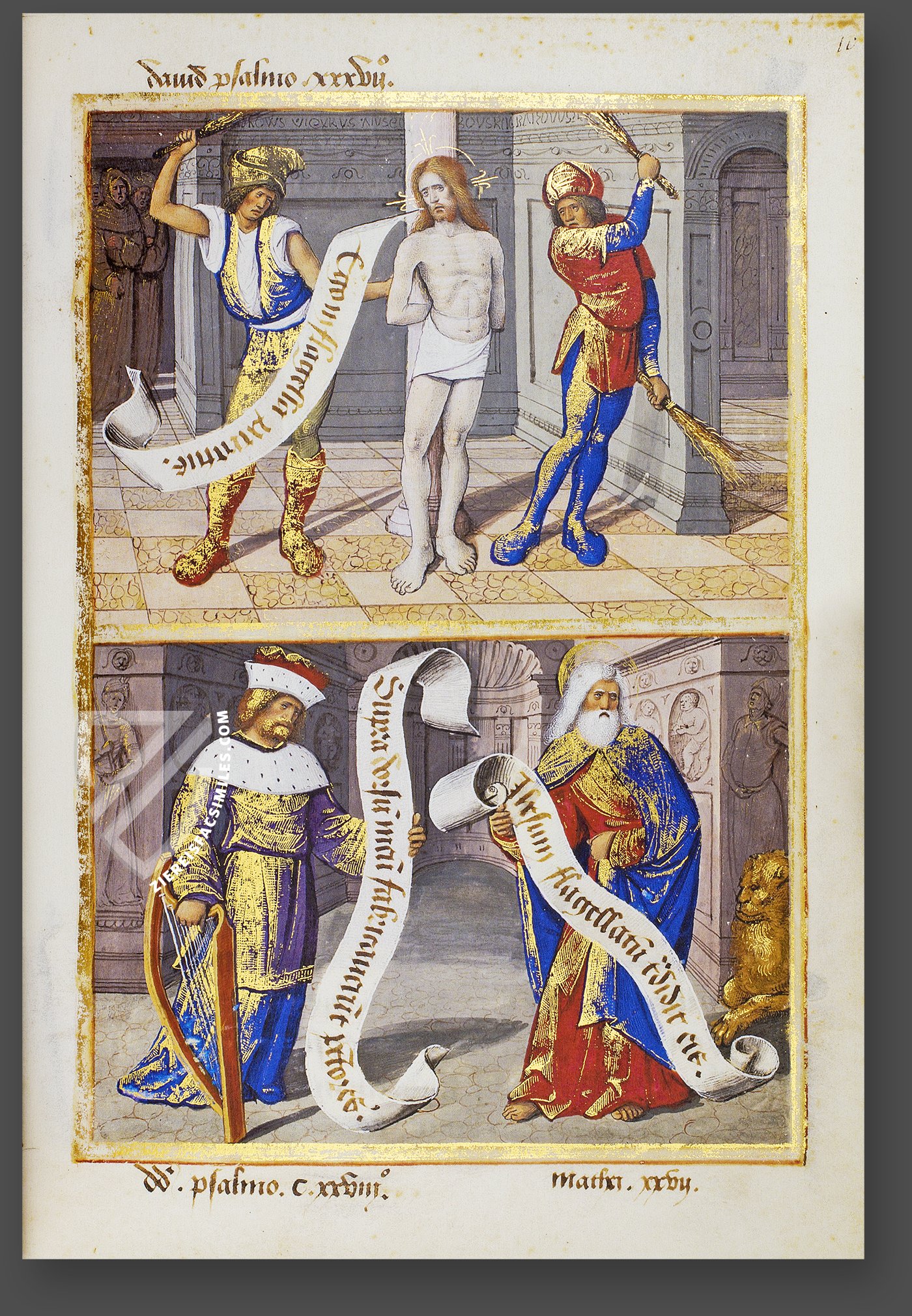 In the Middle Ages, the pagan sibyls were repurposed as prophetesses for the coming of Christ and episodes from the Gospels were incorporated: Christ stands tied to a column stripped to the waist as two soldiers are about to flog him, Christ is calm and composed, looking out at the beholder with a look of resignation. His tormentors appear to be dressed like Turks, perhaps representing anxieties in Europe following the Fall of Constantinople and their subsequent invasion of the Balkans.