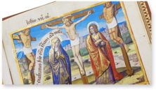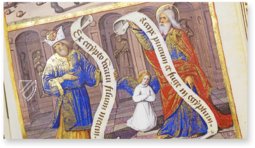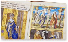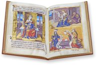 Following this wonderful and elegant depiction of Noahβs Arc in the Munich manuscript are 24 large-format miniatures on 12 double-pages. A depiction of one of the Sibyls is found on each the reverse pages, with a miniature in two registers on the opposite page, respectively: each with a prophet to the left and an Evangelist to the right in the lower register and the corresponding scene from the life of Jesus in the Gospels. The enthroned Sibyls are presented in splendid, precious garments trimmed with fur, brocade, and golden accents. Their prophecies are legible on a scroll (where their names, ages, and further information is also specified). An exceedingly varied design underlines the great artistry of the miniatures. So the throne is depicted in a different location in each miniature, sometimes in profile, sometimes directly facing the beholder. Countless figural reliefs and statues on the walls, the throne, and in the background adorn the scenes. The architectural borders of the wondrously perspectival compositions round out the depictions.