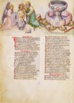 The miniatures present the biblical stories completely in the raiment of the Middle Ages. Knights and warriors in chainmail and suits of armor, typical 15th century garments, an unambiguously medieval-style crown, and numerous architectural elements with Gothic forms characterize this unusual impression. Thus, the beholder encounters saints in the shape of noble ladies and biblical events in front of medieval backdrops. Elegant, graceful figures in flowing robes people the fascinatingly arranged scenes. Numerous details highlighted in gold crown the high-quality picture cycle and lend the pages of the manuscript a glimmering charm.