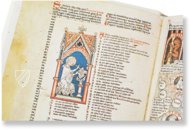 The true value of the Kremsmünster manuscript resides in its numerous miniatures which, in outspoken simplicity, greatly impress the beholder. Blue and red backgrounds alternate while the figures emerge before them in the natural color of the parchment. Their faces are generally lit with friendliness, charm, and a sympathetic mood. Evil faces, in contrast, are smeared in black. Everyday objects are represented: architecture and vestments provide an interesting insight into the culture of the early 14th century, making the manuscript a true treasure trove for the cultural history of this period.