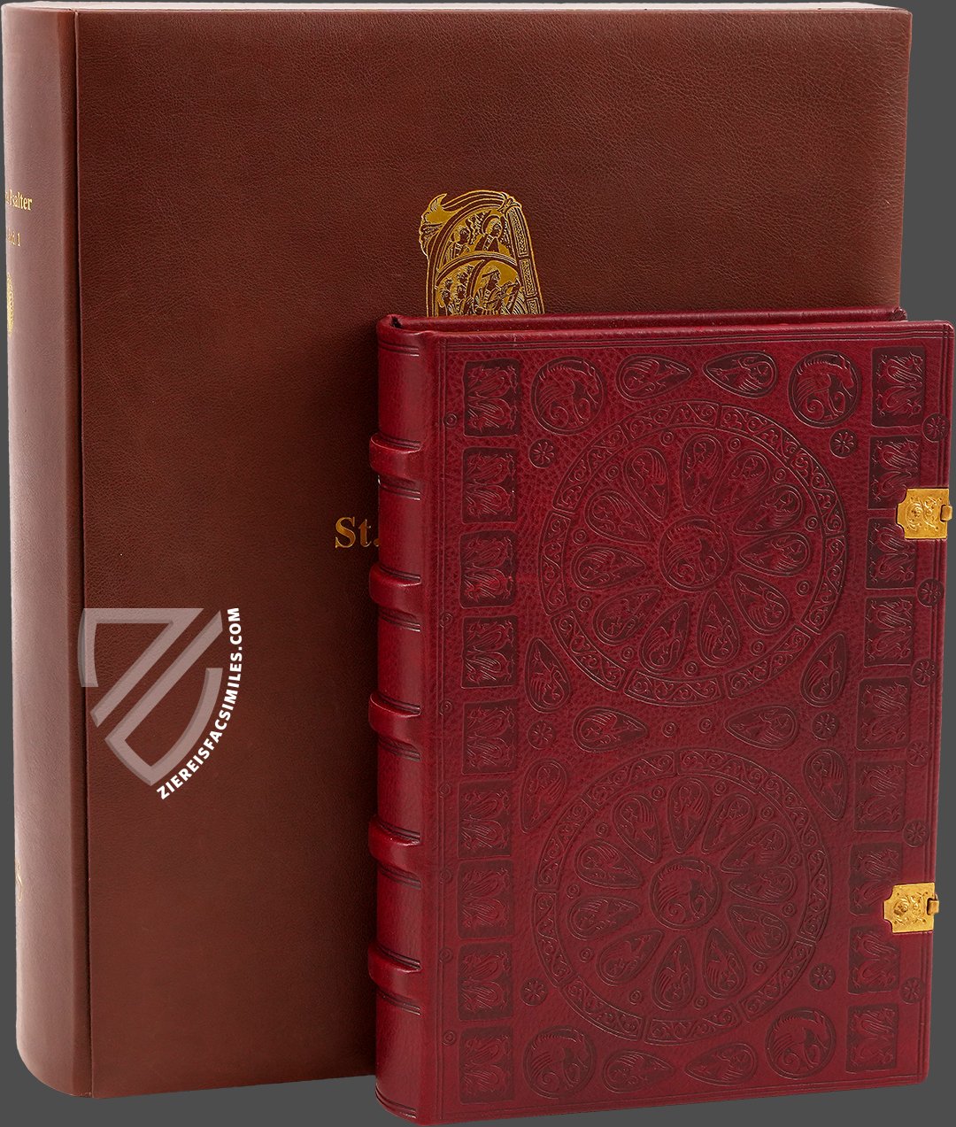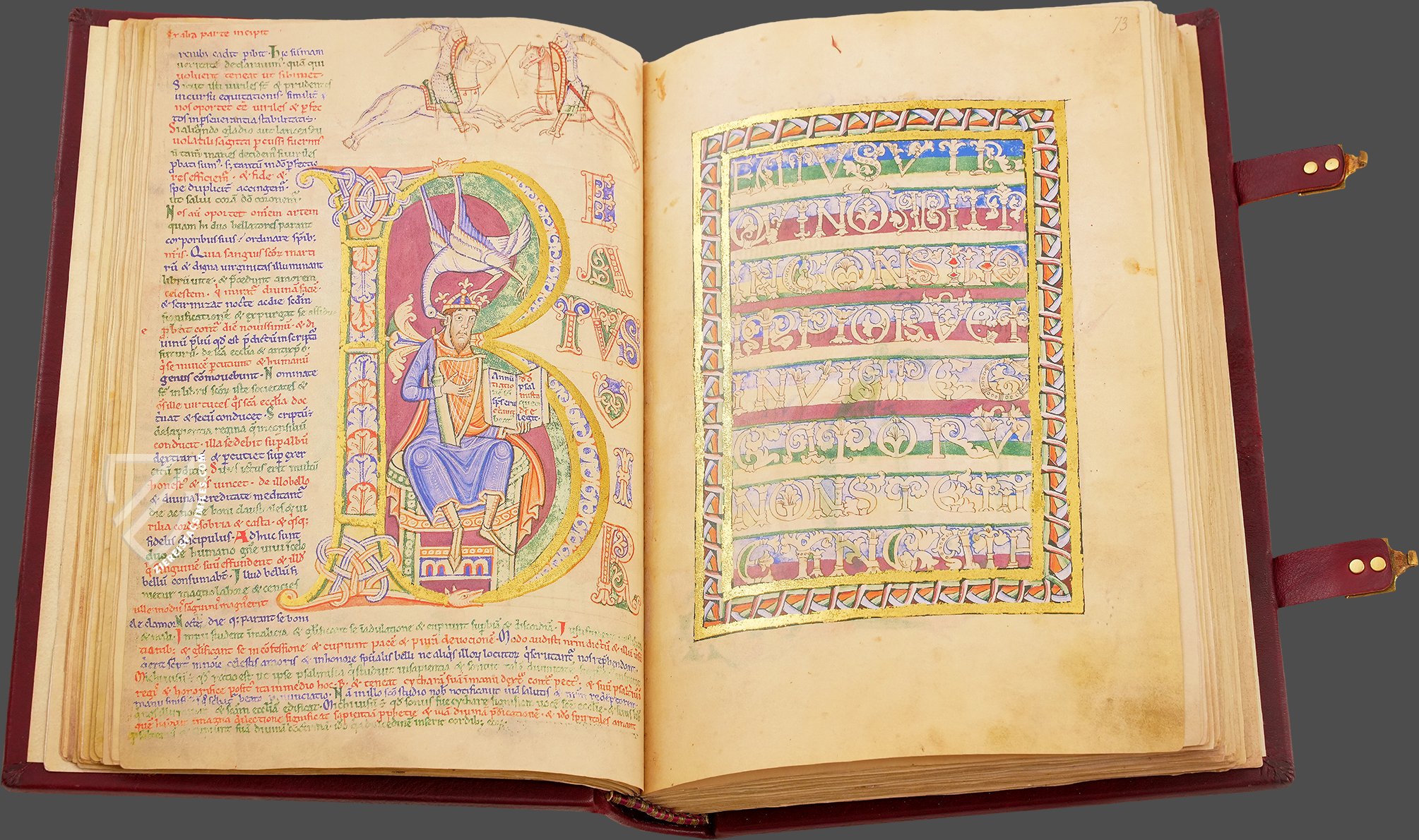 St. Alban’s Psalter is considered to be the indisputable high point of English Romanesque illumination. With a total of 42 full-page miniatures and over 200 large-format initials, hardly any other manuscript is so artistically adorned. The eminently comprehensive Psalter contains the majority of the beloved Psalms of King David and additionally a liturgical calendar, prayers, hymns, and other unusual texts. It was created at the beginning of the 12th century in the English abbey of St. Alban as a commission of the abbot there, Geoffrey de Gorham, for Christina of Markyate.
