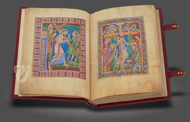 The St. Alban’s Psalter is considered to be the indisputable high point of English Romanesque illumination. With a total of 42 magnificent full-page miniatures in beautiful ornamental frames and over 200 large historiated initials, hardly any other manuscript is so artistically adorned. The eminently comprehensive Psalter contains the majority of the beloved Psalms of King David and additionally a liturgical calendar, prayers, hymns, and other unusual texts. This masterpiece of book art was created by the so-called Alexis Master in the second quarter of the 12th century in the English abbey of St. Alban. The abbot there, Geoffrey de Gorham, had the Psalter made as a gift for the hermit Christina of Markyate, with whom he had a profound spiritual friendship. Numerous references to Christina, such as portraits of the pious hermit or a reference to her death, make the manuscript, in addition to its artistic value, a very special, personal testimony to a close friendship and the spiritual life of a deeply devout woman of the High Middle Ages.