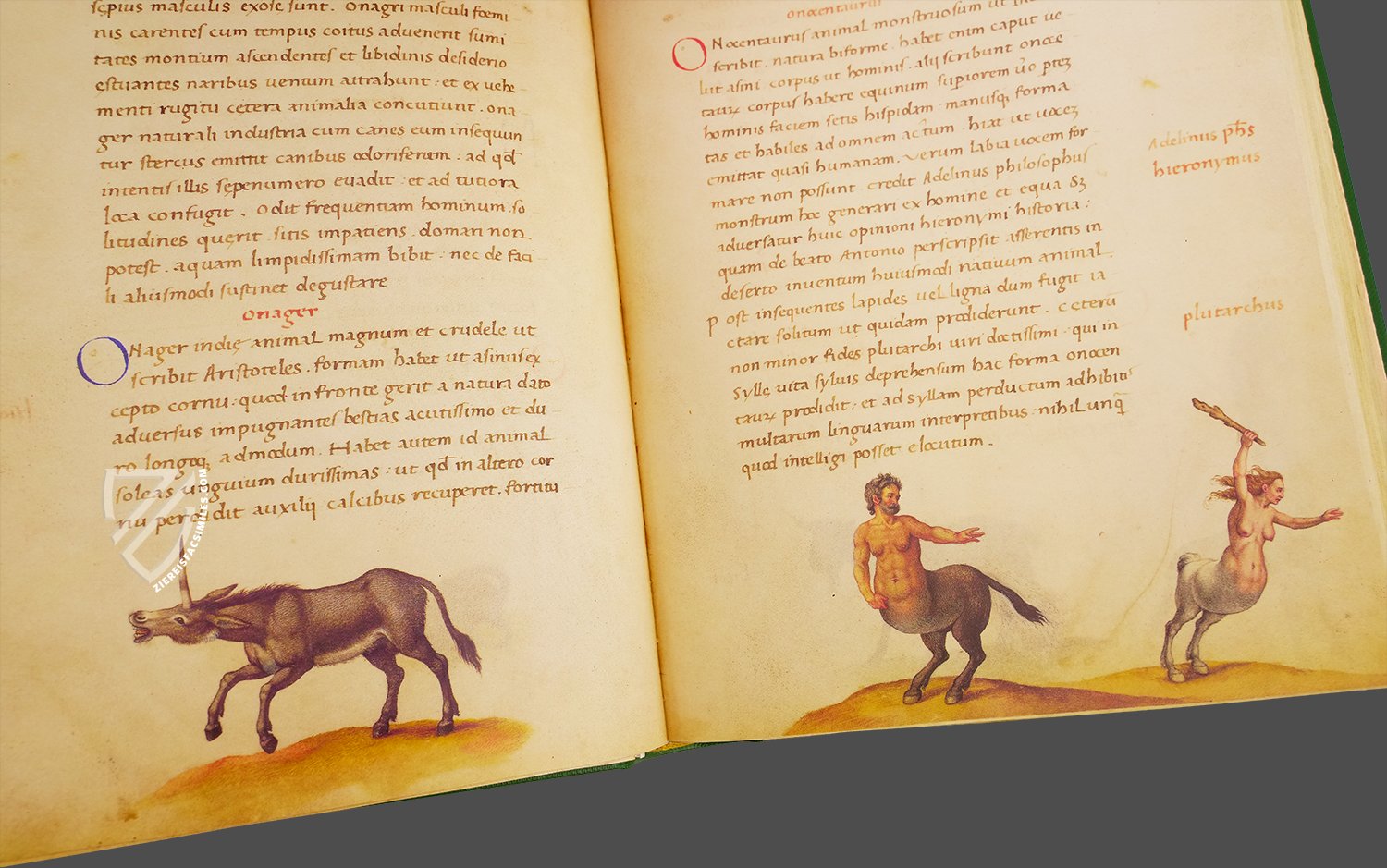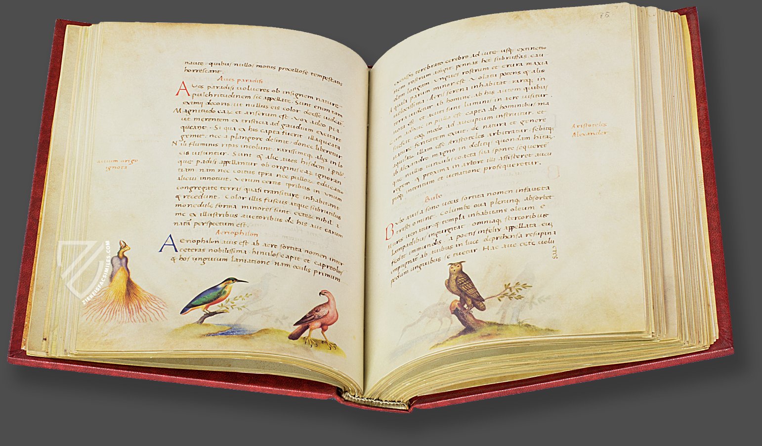 Ludovico Gonzaga, Marquis of Mantua, commissioned the lexicon. The Marquis was famous as a great lover of animals. Candido composed a work that contained all of the natural scientific information which was known in 1460. He allowed for the influence of mythological stories and in doing so created an informative and exciting book, which was illuminated with colorful images ca. 1550. The miniatures show realistic animal figures in eight different colors. Many of the miniatures were additionally embellished with decorative elements of gold and silver. The book margins were set in 23 carat gold. The natural history of the Renaissance was bound here in one of the Vaticanβs most splendid codices.
