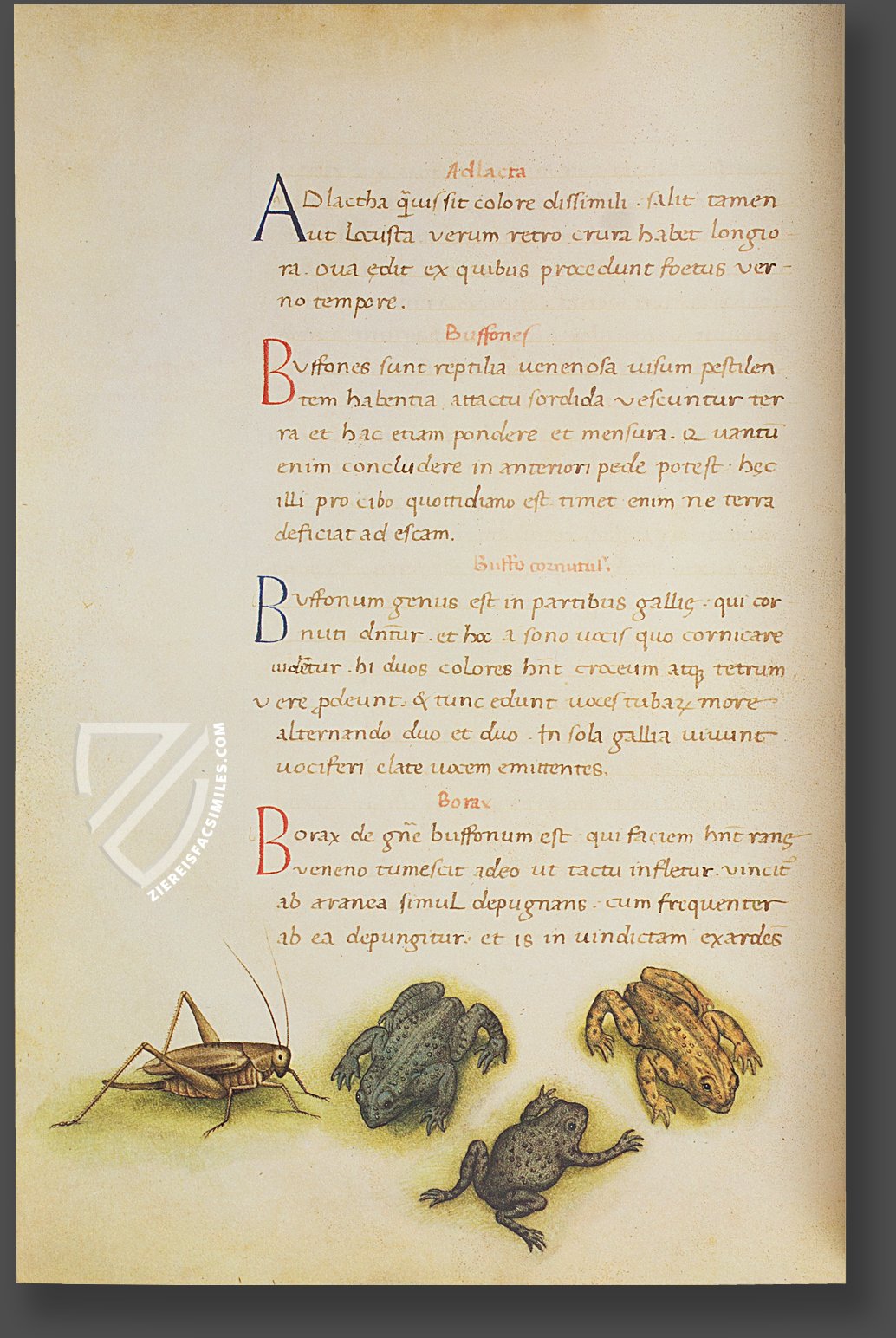 There is a highly valuable collection of zoological manuscripts in the Apostolic Library of the Vatican. Descriptions and depictions of animals of all kinds, as they were seen in nature by the respective book masters, are found in these books. Our modern biological knowledge naturally did not yet play any role at that time. One of the most famous works of this kind is The Animal Book of Pier Candido. It is an astounding encyclopedia, which was able to combine contemporary natural studies with medieval myths and legends. The work was created ca. 1460 and was endowed with a total of 496 colored and gold-adorned illustrations around 100 years later.