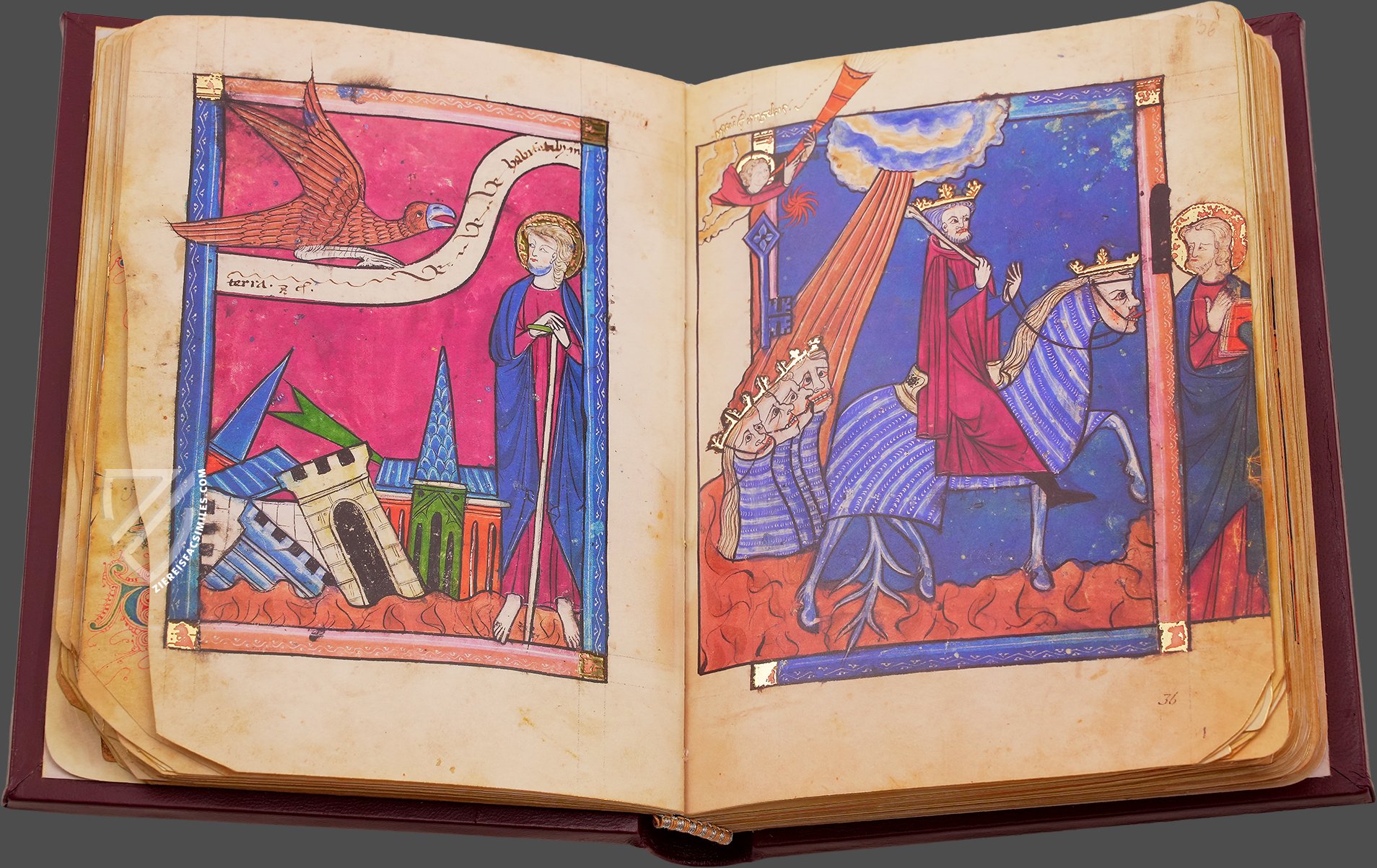 Although many of the details regarding this splendidly illuminated manuscript remain unclear, it has been deduced by researchers that the 52 full-page miniatures brightly colored and embellished with gold leaf, some in the style of the Bolognese school and the rest in the French style, were created in Metz during the late-13th century. The image program appears to be modelled on contemporary English Apocalypse manuscripts, the Lambeth Apocalypse in particular. As such, this work is a hybrid of artistic influences that predates the International Gothic style by a generation or two. Internal elements of the text indicate that it was added to the manuscript between 1331 and 1334: a note on fol. 72v refers to the reign of the Avignon Pope John XXII, which ended upon his death in 1334, and another note on fol. 73v is dated 1331. The text was neatly written in two columns by a skilled hand and is adorned by filigree tendrils, historiated and zoomorphic initials, and various figures.