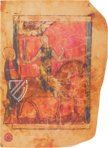 This βIβ initial following an incipit written in red ink depicts the dragon, a manifestation of Satan that is typically depicted with seven heads. During the War in Heaven, the Archangel Michael and his angels do battle with Satan and his fallen angels, who are cast down to earth and lose their fair hues. This is represented here by the figure of a naked man falling from an orb that is gold on top (heaven) and blue on the bottom (earth).