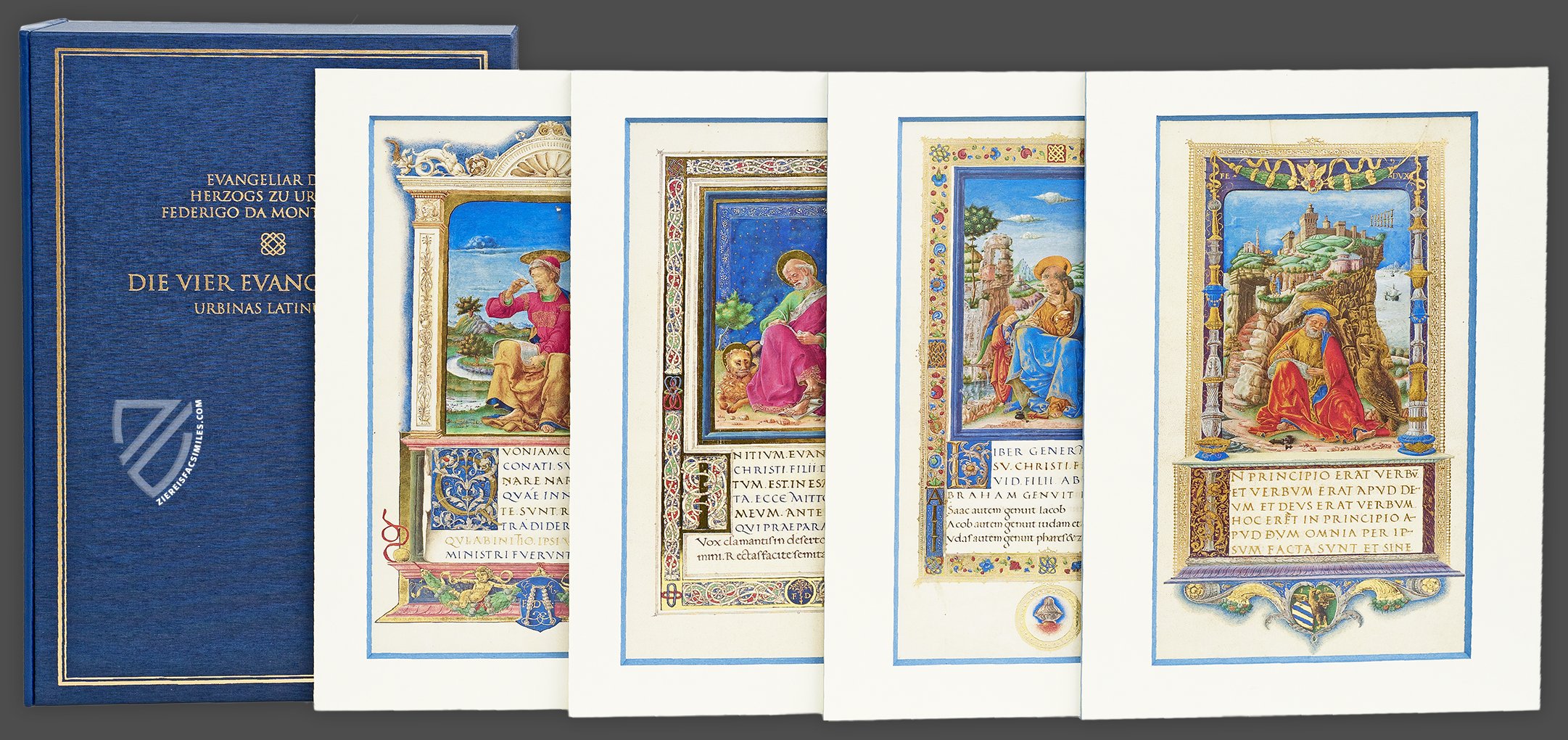 This single-page collection presents four of the most stunning Evangelist portraits probably ever created. They derive from the splendid Gospels of the Duke of Urbino, Federico da Montefeltro (1422–82), which is preserved in the Vatican Library under the shelfmark Urbinas Latinus 10. The precious manuscript was produced around 1474 either in Ferrara or Urbino by order of the famous condottiere, who was known for his spectacular rise and military skill, but also as a great patron of the arts and a just lord who ruled according to humanistic principles. The four large-scale and gold-decorated Evangelist images of his Gospel Book represent a highlight of his rich art collection, and are notable for their realistic depiction of the body and their breathtaking coloring. The four Evangelists are set in wide, fantastical landscapes against brilliant blue skies, while the pages are enclosed by beautiful decorated framings.