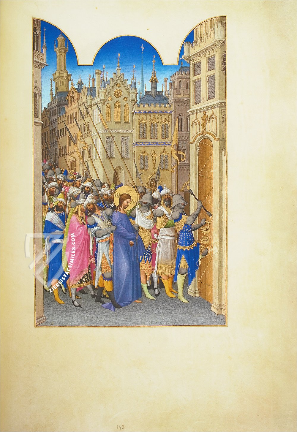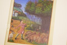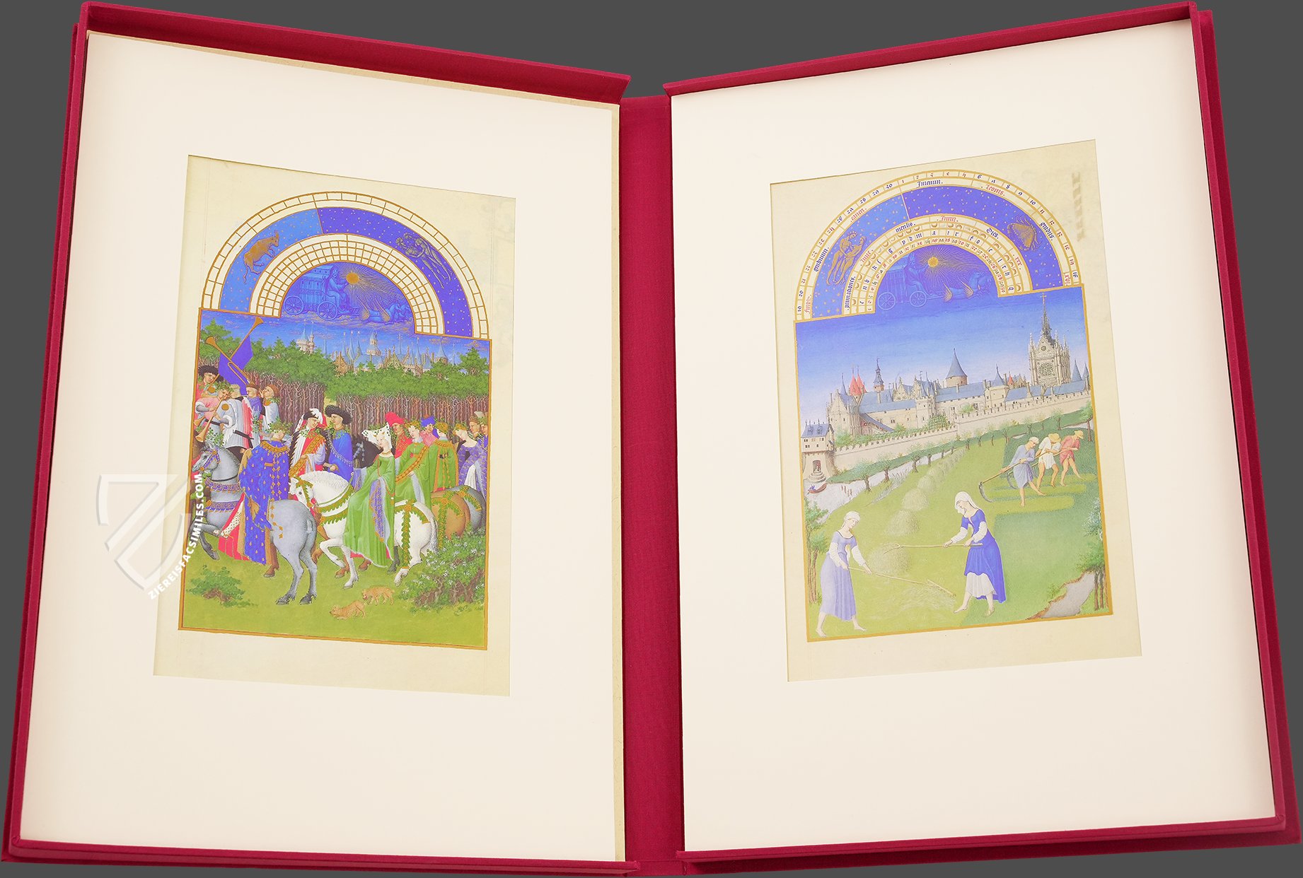 In the miniatures, the Limburg brothers convey a medieval world that appears to be magical and leaves every beholder in astonishment. Their masterful skills, their knowledge of coloration and composition, as well as their exact powers of observation could be exceeded by no other illuminators in the world. The images thematize scenes from life at the court of the Prince of Berry, as well as everyday scenes from the life of the rural population. The exertions of field work, the enchanting beauty of the countryside, the monumentality of castles and walled cities, the magnificent garments of French high society, and the simple clothes of the peasantry are depicted. The manuscript reproduces the whole breadth of life in medieval France in a breathtaking manner.