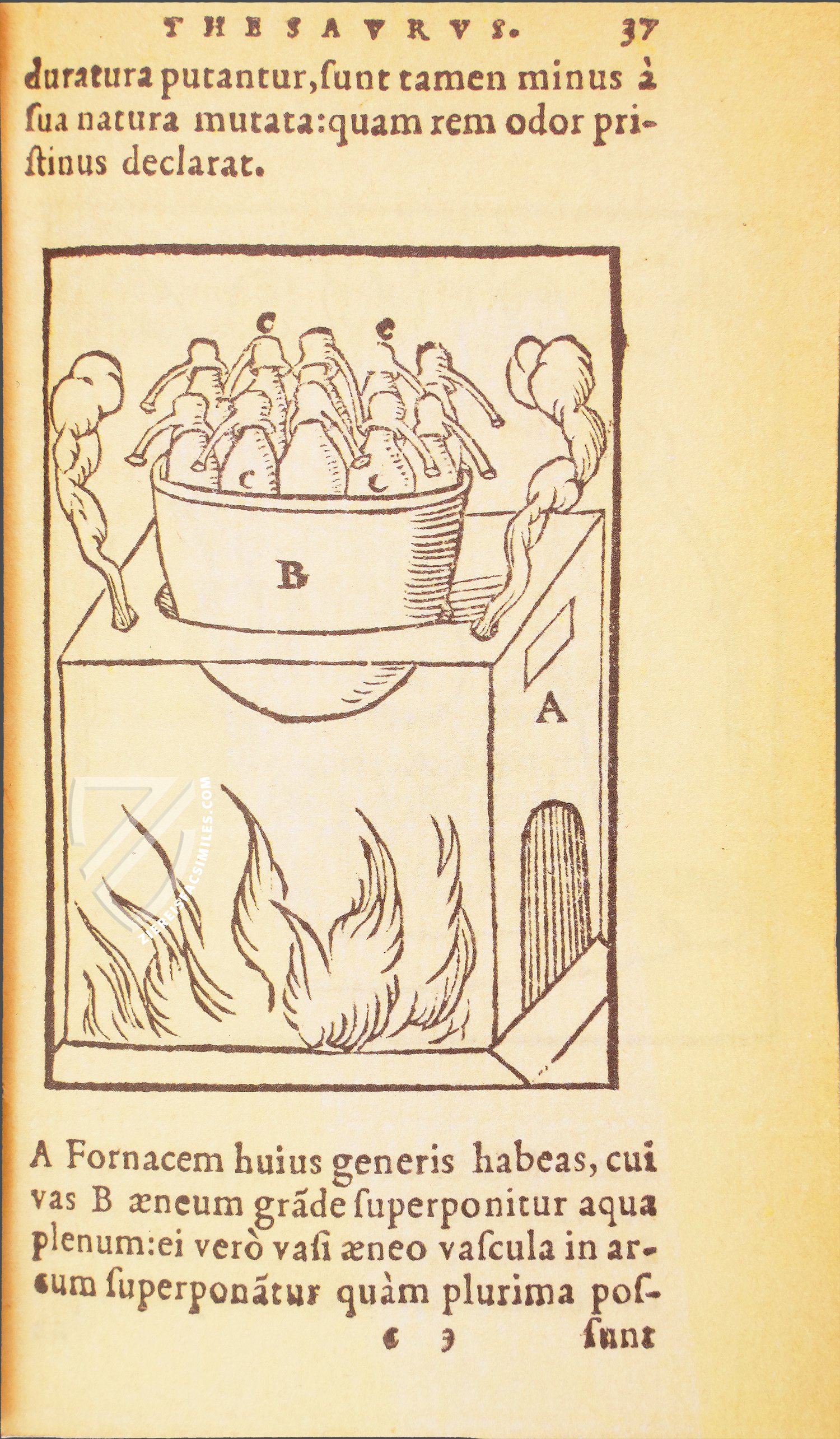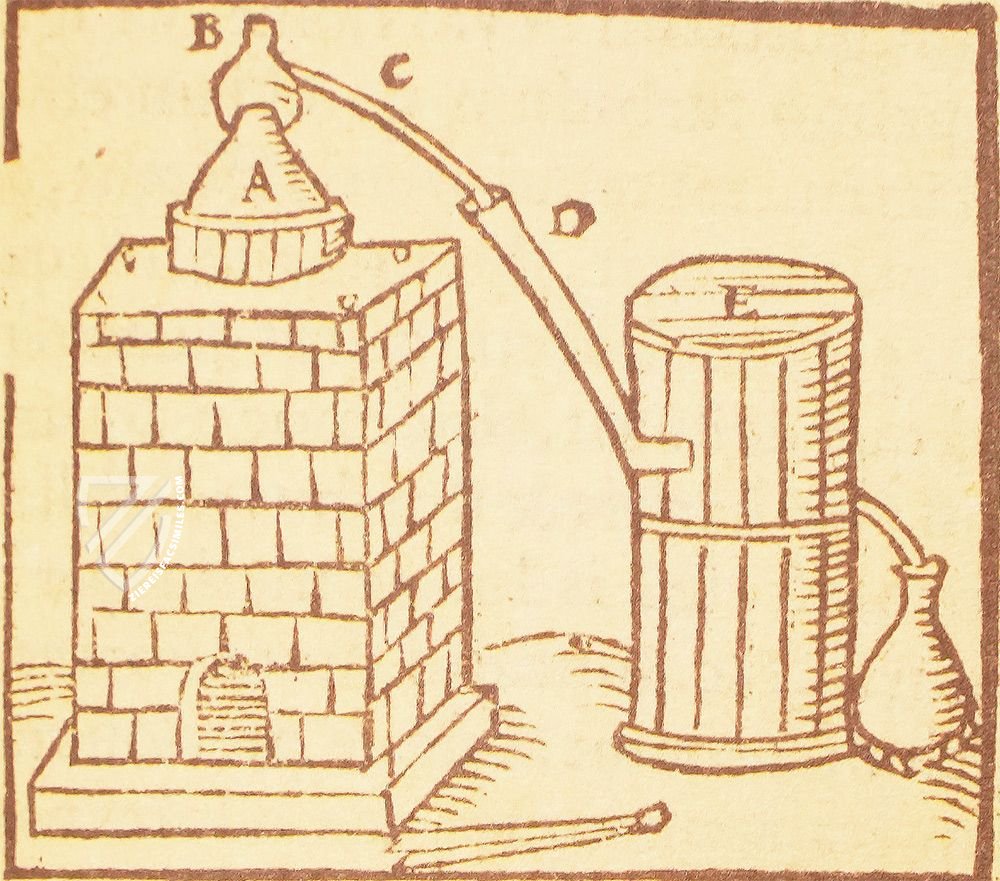 This miniature illustrates a detailed description of a method for distilling oil from wood, cloves and similar plant material, based on the Italian Renaissance humanist Gerolamo Cardano. Each part of the distillation apparatus explained in the text is labeled chronologically with a capital letter. Not shown is the clay casing of the apparatus, which is intended to prevent air, water or oil from escaping before the end of the process.