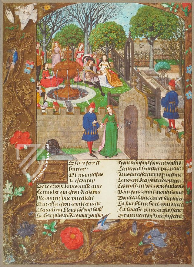 This splendid miniature of the Garden of Pleasure is found in a late-15th century manuscript of the Roman de la Rose, which is stored in the British Library under the shelf mark Harley 4425. It is presented in a masterfully executed trompe l'oeil frame with birds and flowers that gives the miniature the appearance of a panel painting.