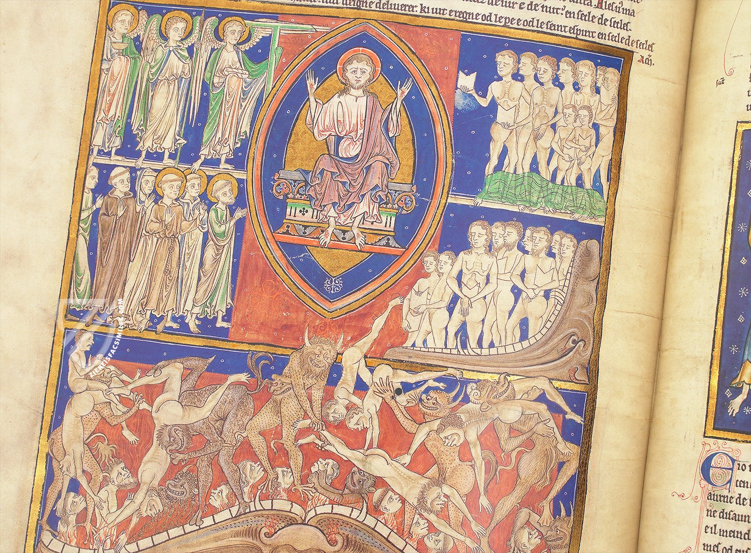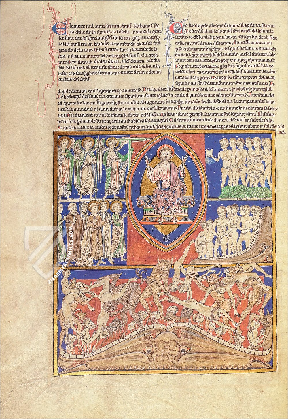 The apocalypse manuscript named after its repository in Cambridge has come up with a pictorial treasure that is without equal. In over 100 pictures, the Revelation of John about the end of the world and the Day of Judgement is portrayed in wonderful colorful, richly detailed miniatures. The magnificent Trinity Apocalypse, which was created for an unknown commissioner, can be classified stylistically in the English artistic landscape, but simultaneously exhibits French-Gothic characteristics.