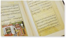 A rich merchant who goes on a business trip and his beautiful young wife who must wait for him at home – the merchant is understandably worried. In order to give his wife something to do in his absence, he gives her a starling and a parrot. The young woman quickly turns her head to the starling when it dutifully tries to advise her against an extramarital adventure. Recognizing the seriousness of the situation, the parrot prefers to tell her a story each of the following 52 nights. The woman is so captivated that she always postpones the meeting with her lover for another night – until the merchant finally returns. Parrots often appear as narrators in stories from Persia and India because of their ability to speak. The Tuti-Nama was particularly popular because the texts also offered the opportunity for risqué depictions in the 218 miniatures.