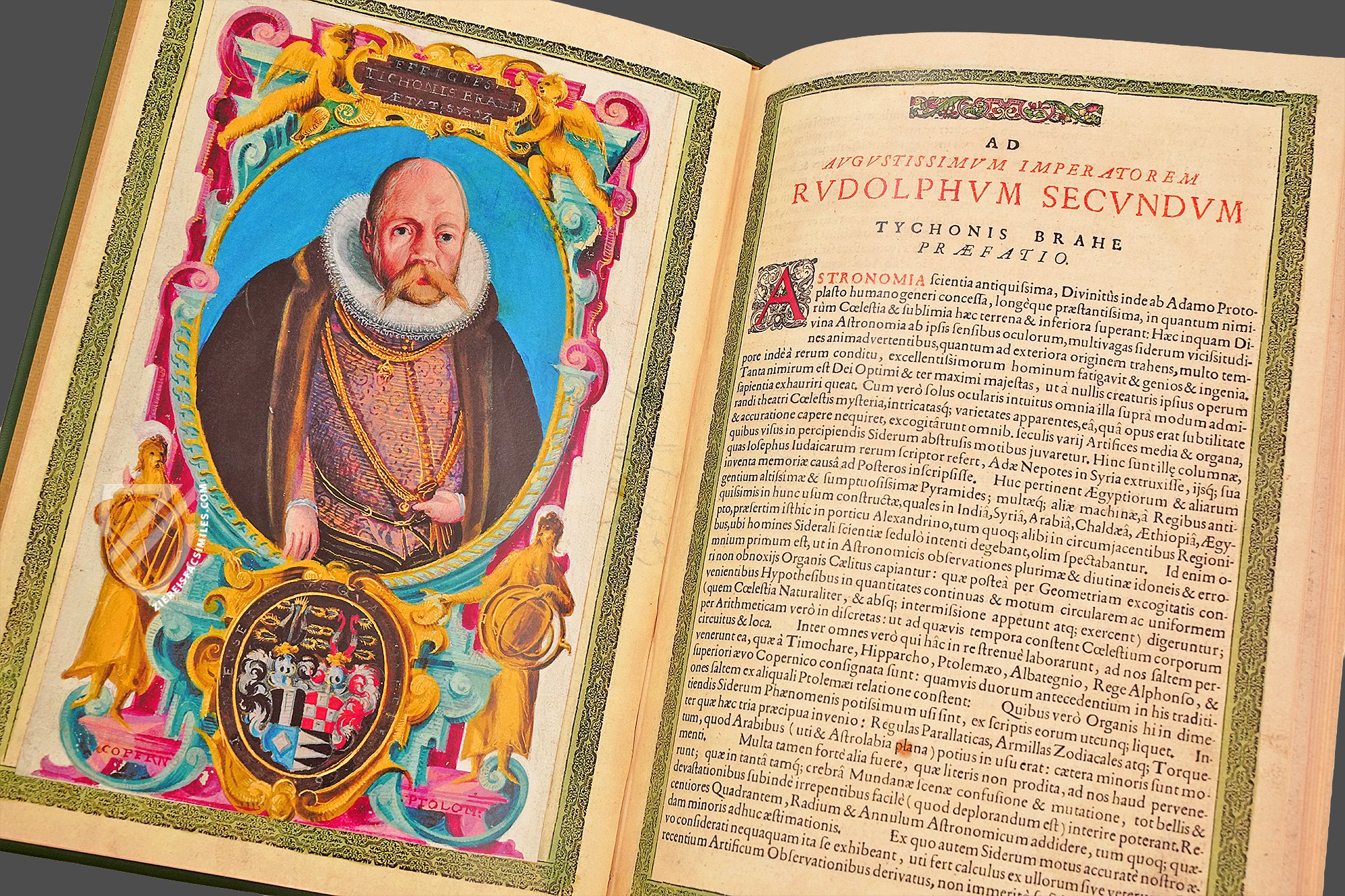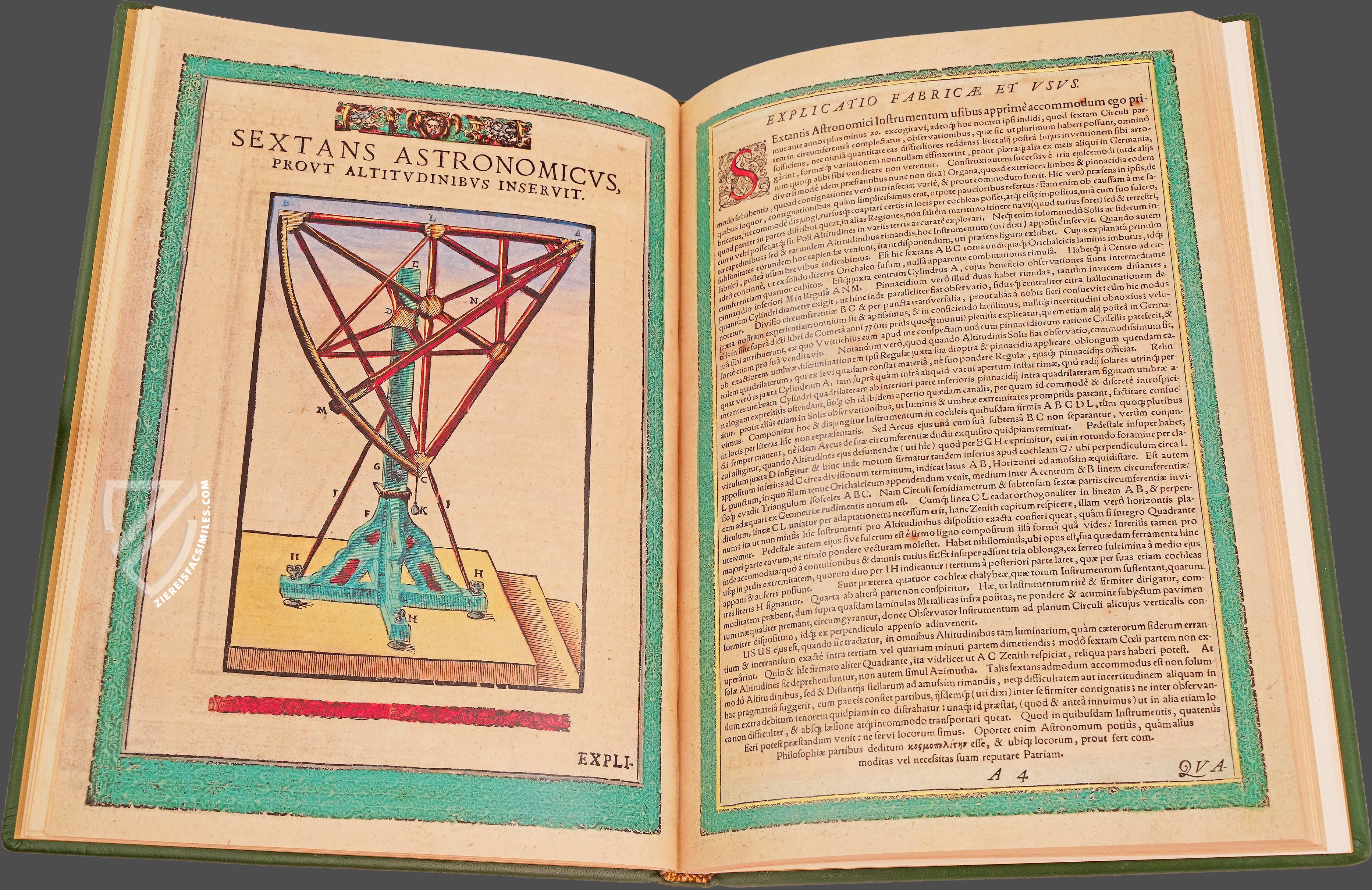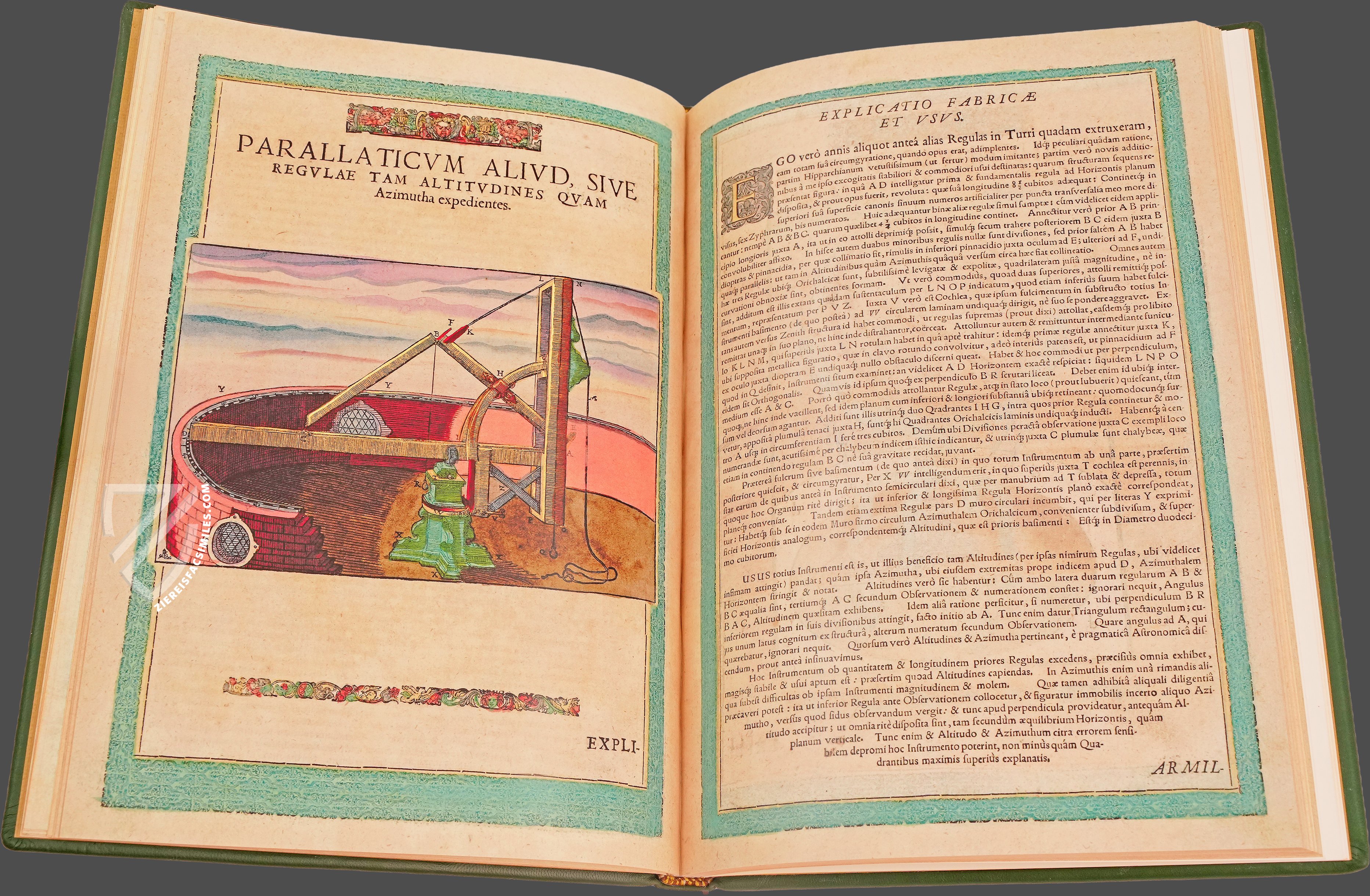 Tycho Brahe (1546–1601) went down in history as an astronomer primarily because of his incredibly comprehensive and precise observations of the heavens, which he carried out without the aid of any lenses — i.e., without a telescope — and which later enabled Johannes Kepler (1571–1630) to discover his groundbreaking findings on planetary motion. With his methodology of repeated and increasingly accurate measurement and reverification, which he was only able to realize with a whole bunch of assistants, he also had a decisive influence on the scientific ideal that is still valid today. None of this would have been possible without the instruments he developed. He recorded his designs in an elaborately illustrated catalog with detailed descriptions: Tycho de Brahe: Astronomiae Instauratae Mechanica. With its accurate and artistically colored, full-page woodcuts and copperplate engravings, it is without question one of the most remarkable scientific books of the Renaissance. The Saxon State Library preserves a copy of the brilliant first edition, which was printed in Wandsbek in 1598 on Brahe's own printing press.
