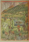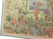 A group of extravagantly dressed noblemen can be seen in the foreground of the miniature as fishermen pull in their catch with nets. Rams climb about the crags of the mountainside to the left while deer run through the woods to the right, both pursued by hunters. The Hapsburg coat of arms and Imperial Eagle seen above the front door indicate that the house is a residence of Maximilian’s.