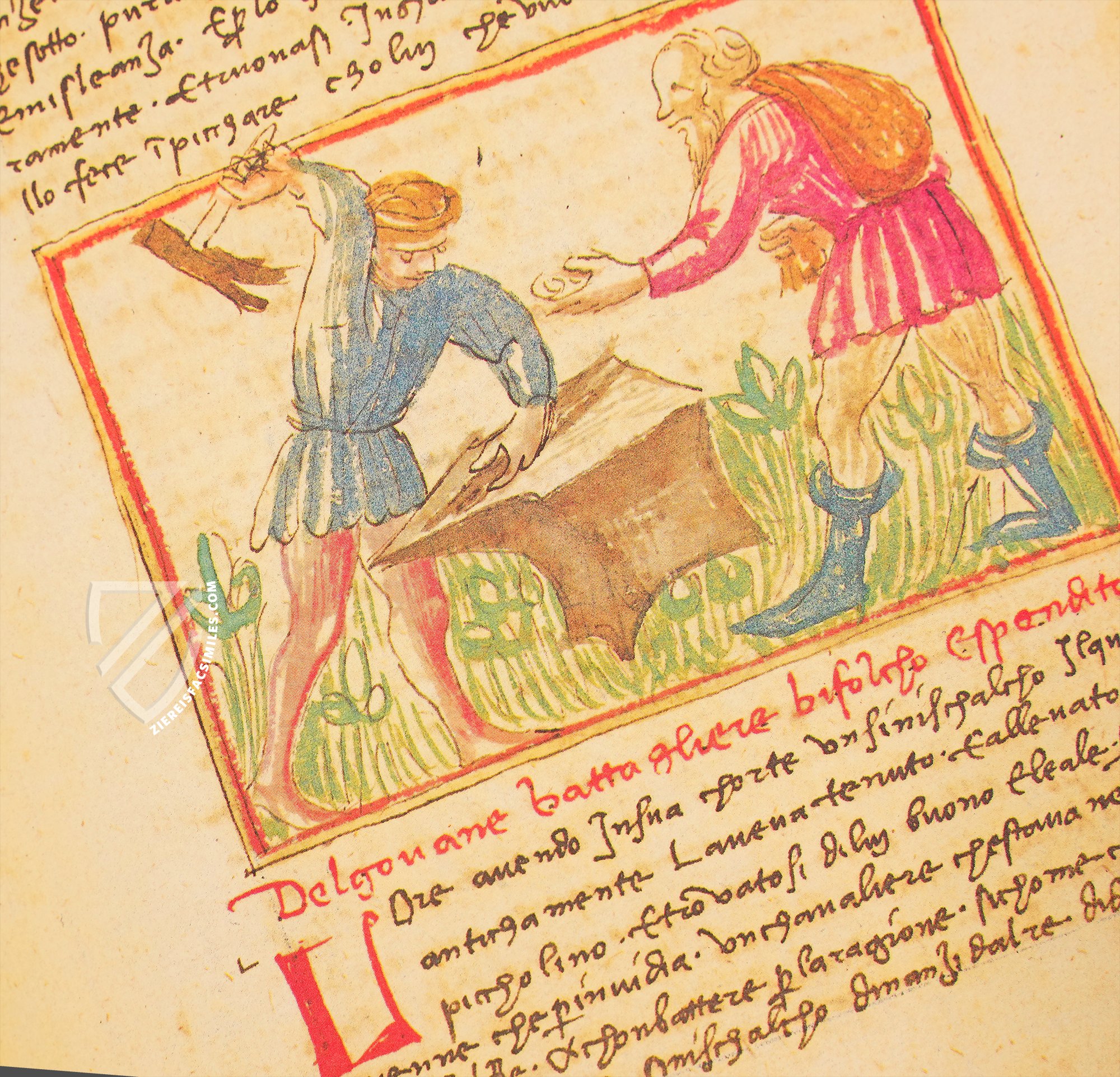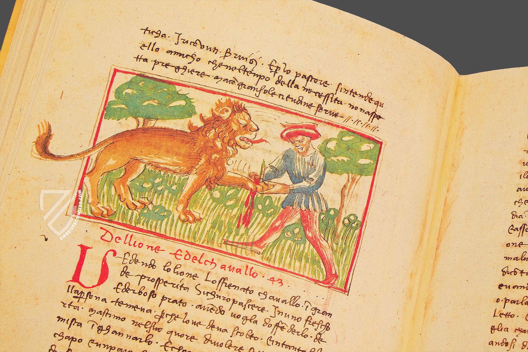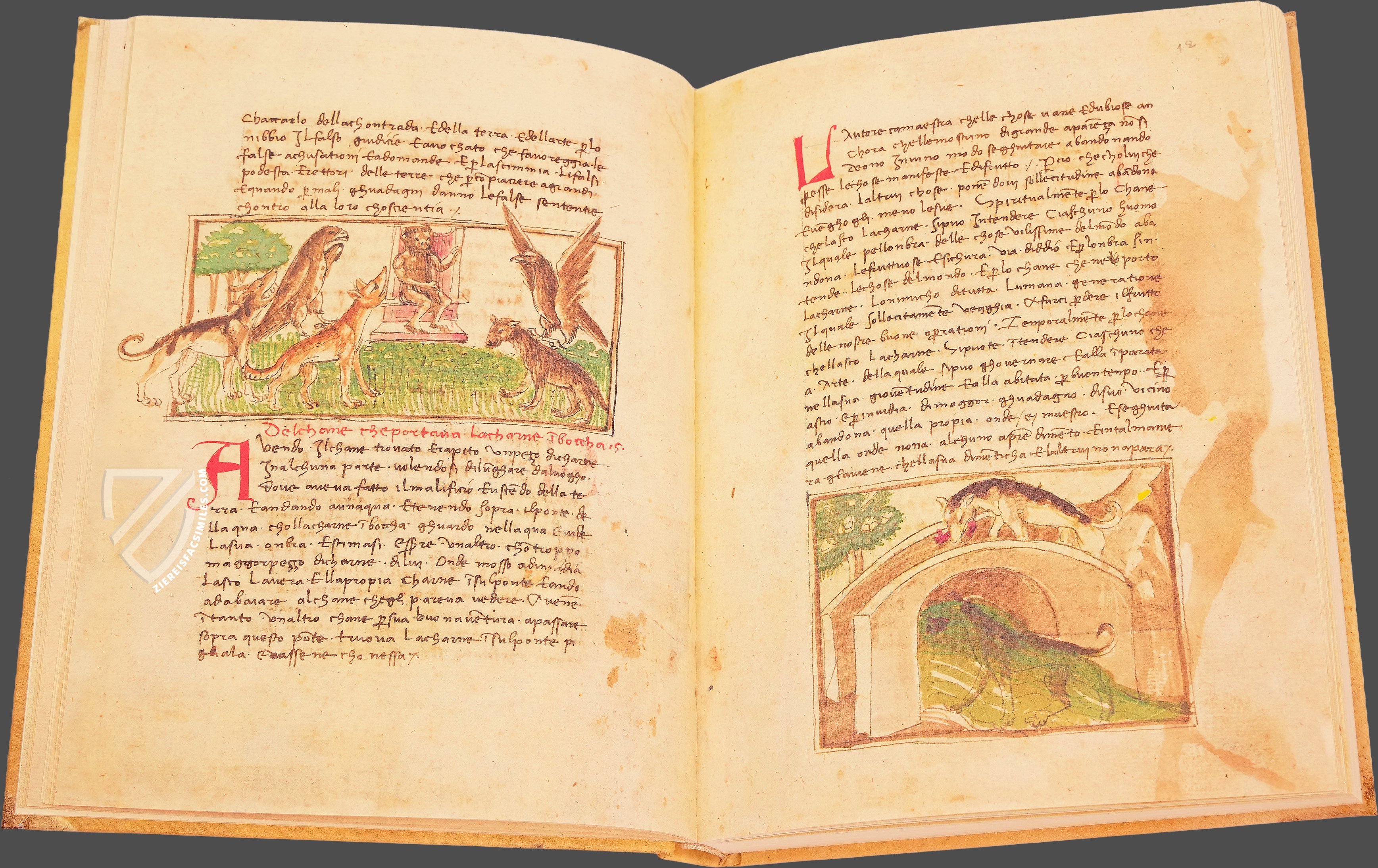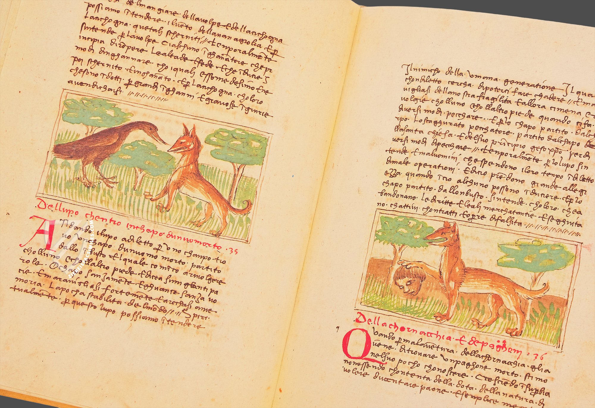 The moral of the story: those who want to defy their own nature will come to harm and may not even be able to regret it. In the Christian Middle Ages and beyond, this was applied not only to physical circumstances, but also to social categories such as class and gender. The miniature, rendered in shades of brown and green, illustrates the adaptation of the ancient fable written in Tuscan Italian, which is introduced by a red lombard “D” at the top of the page.
