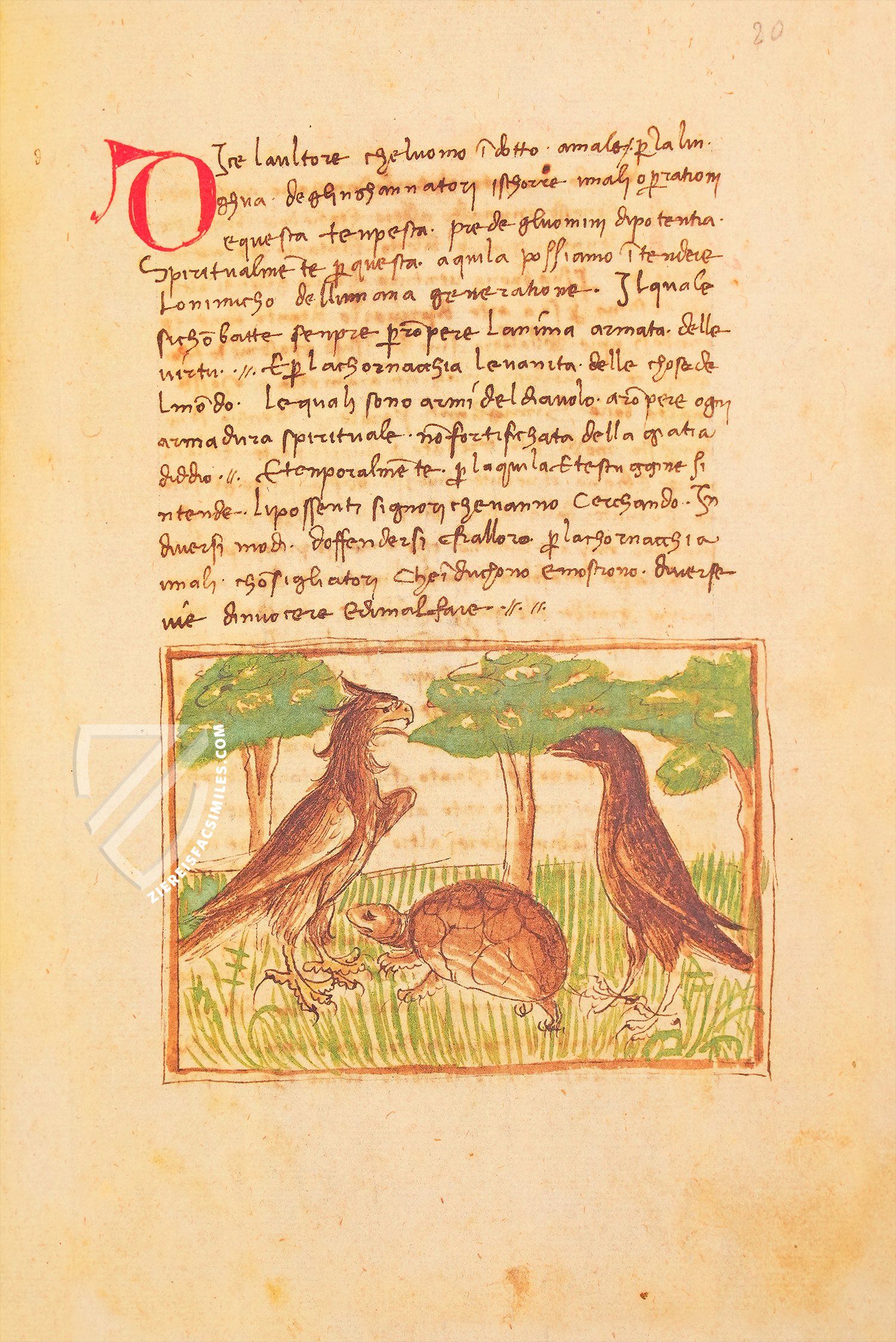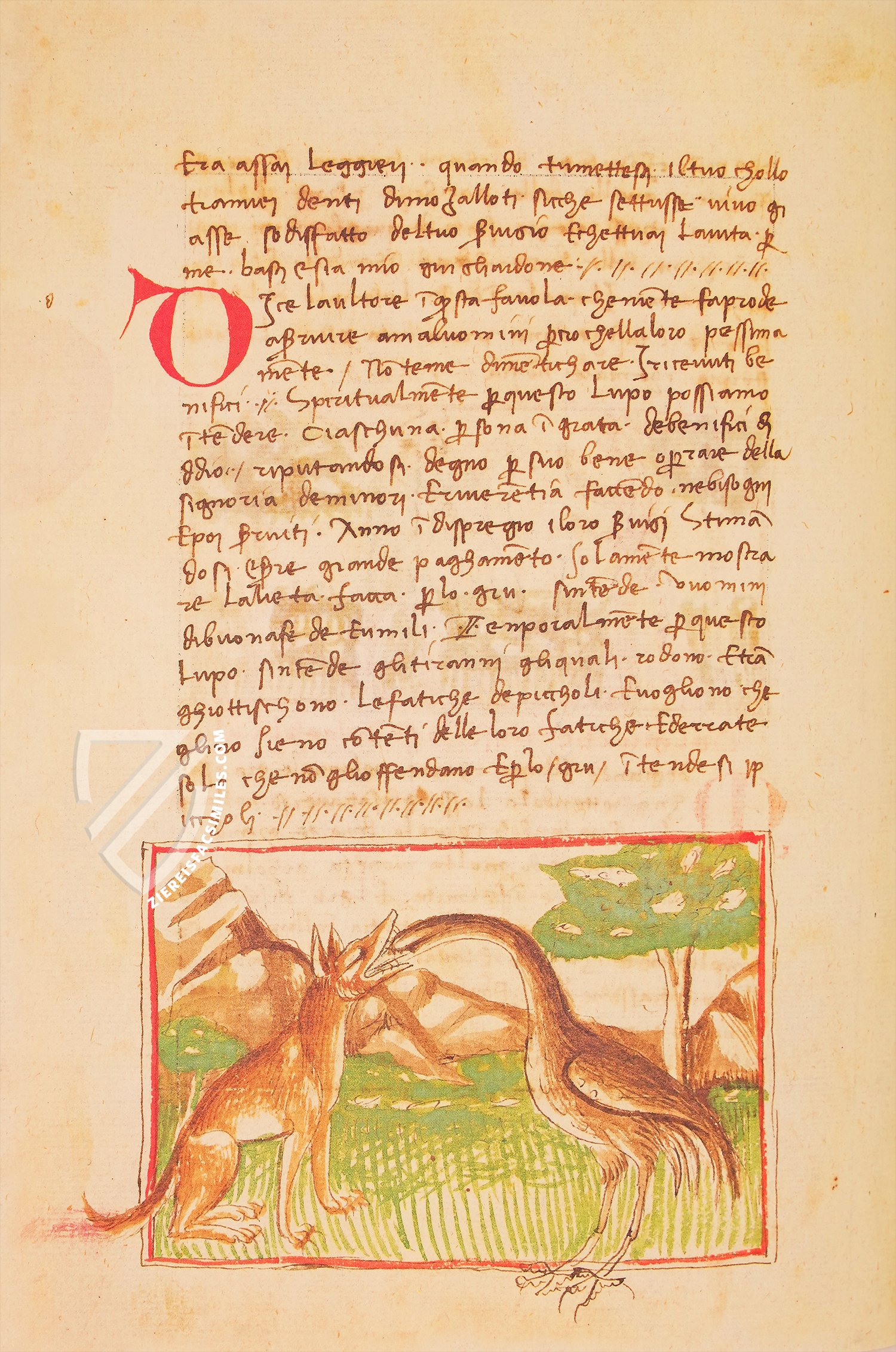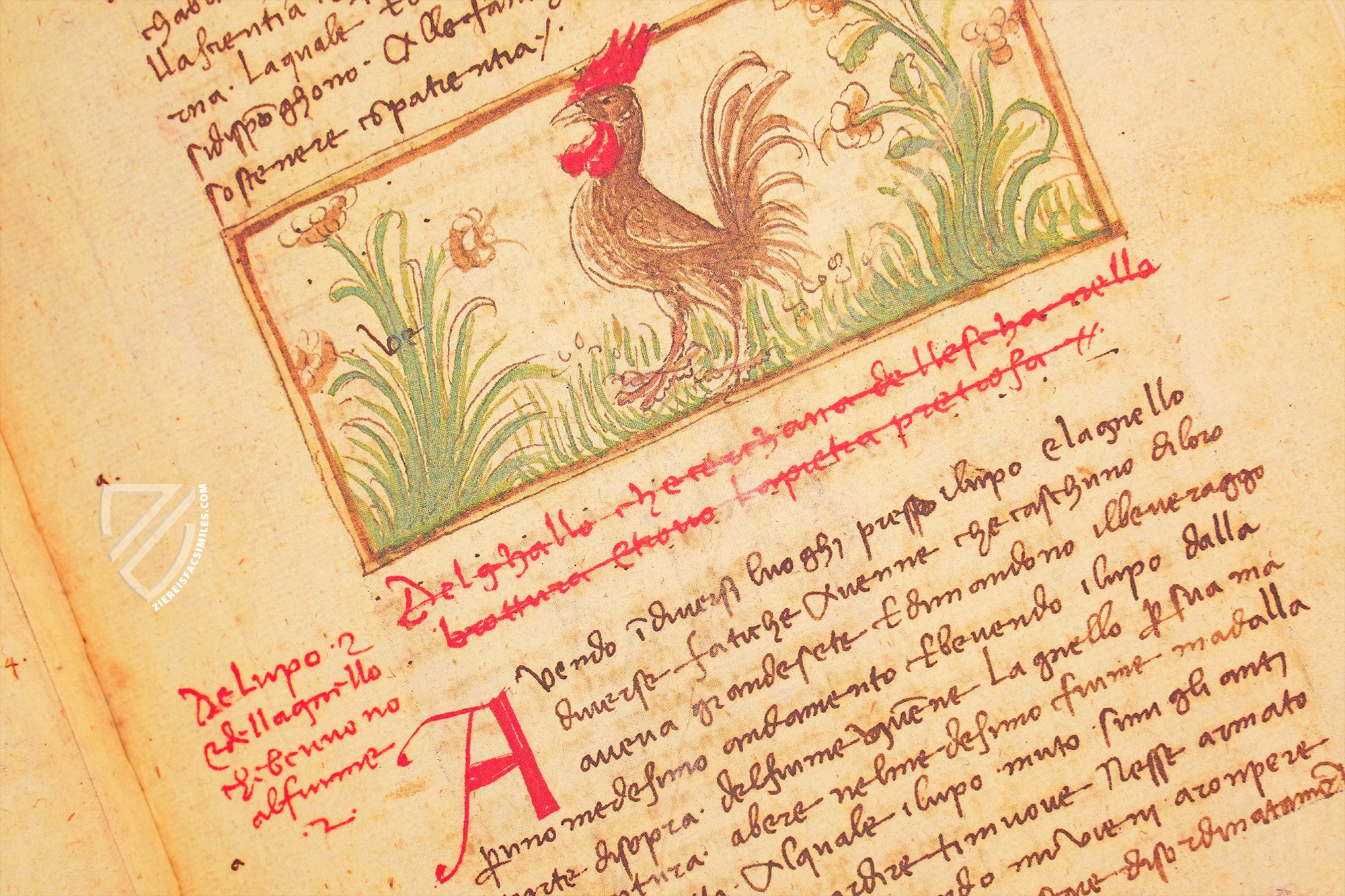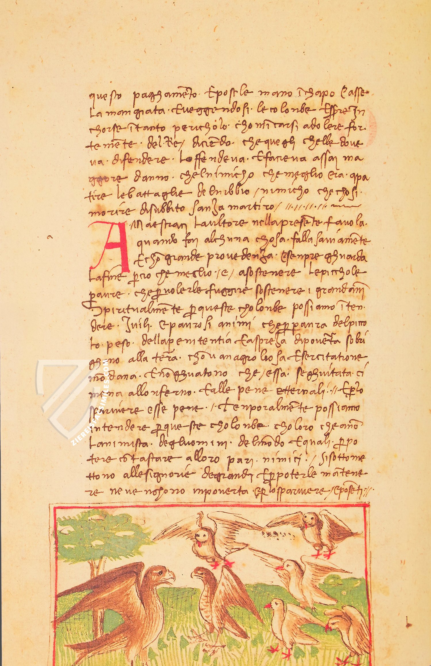 The moral of the story: those who want to defy their own nature will come to harm and may not even be able to regret it. In the Christian Middle Ages and beyond, this was applied not only to physical circumstances, but also to social categories such as class and gender. The miniature, rendered in shades of brown and green, illustrates the adaptation of the ancient fable written in Tuscan Italian, which is introduced by a red lombard “D” at the top of the page.