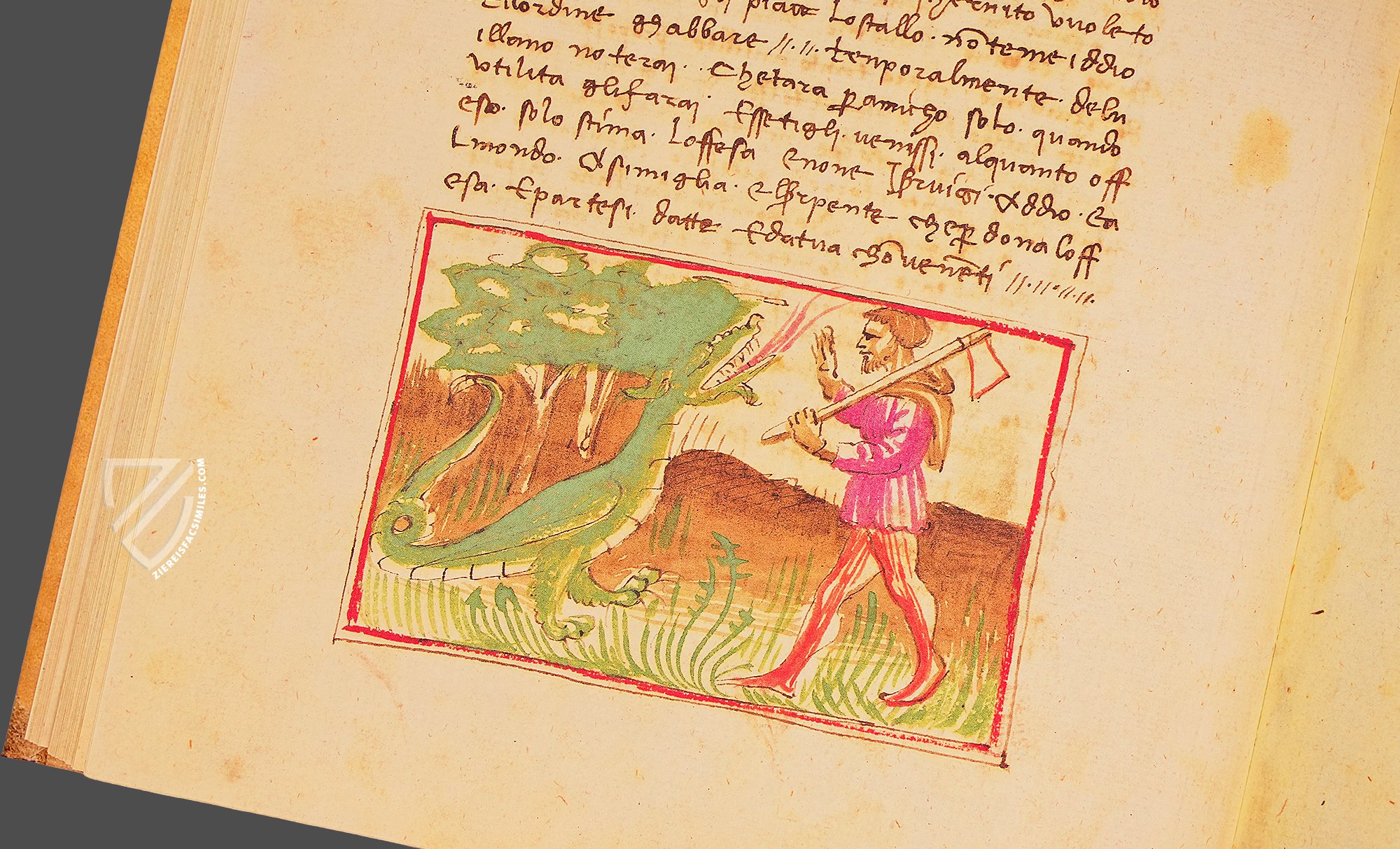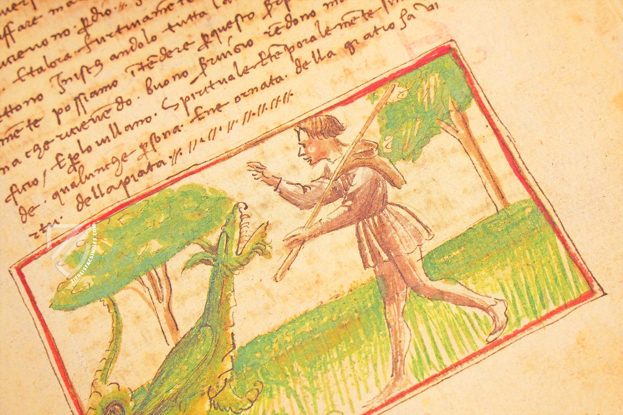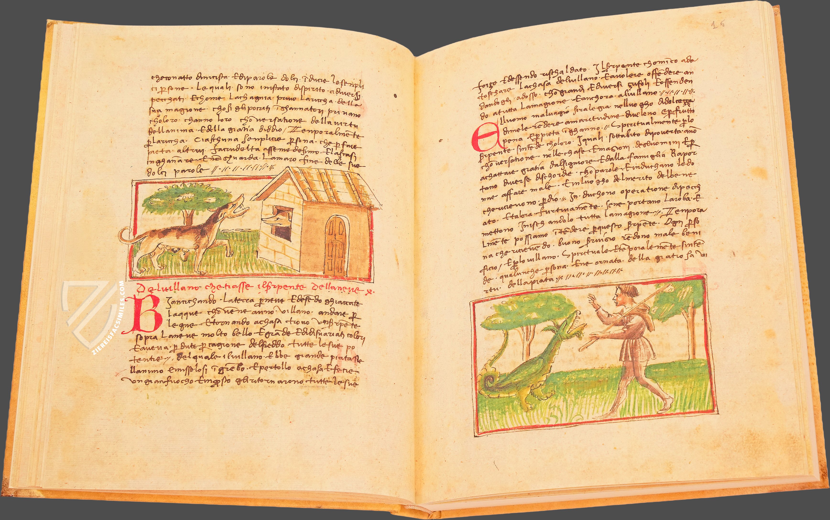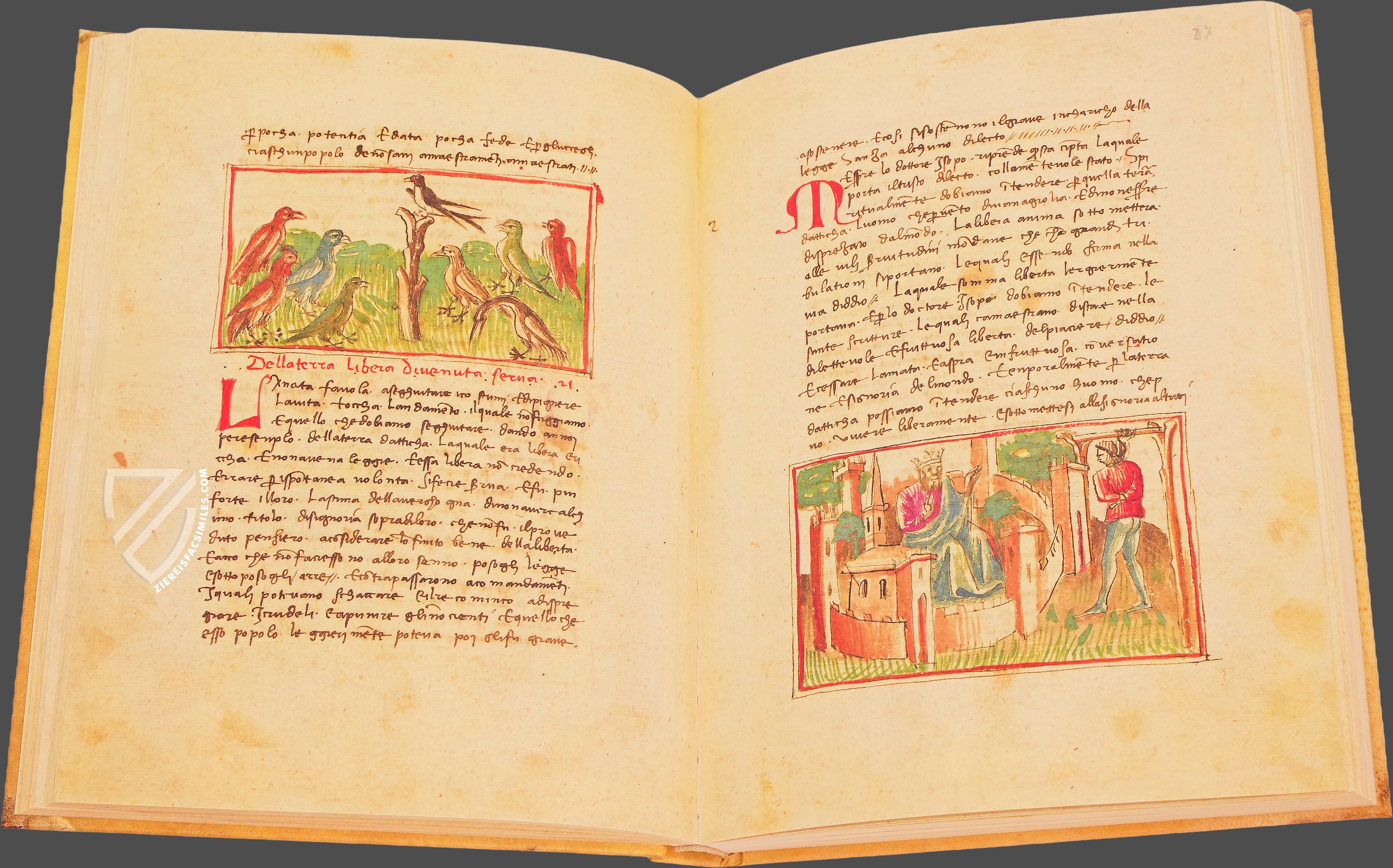 The moral of the story: those who want to defy their own nature will come to harm and may not even be able to regret it. In the Christian Middle Ages and beyond, this was applied not only to physical circumstances, but also to social categories such as class and gender. The miniature, rendered in shades of brown and green, illustrates the adaptation of the ancient fable written in Tuscan Italian, which is introduced by a red lombard “D” at the top of the page.